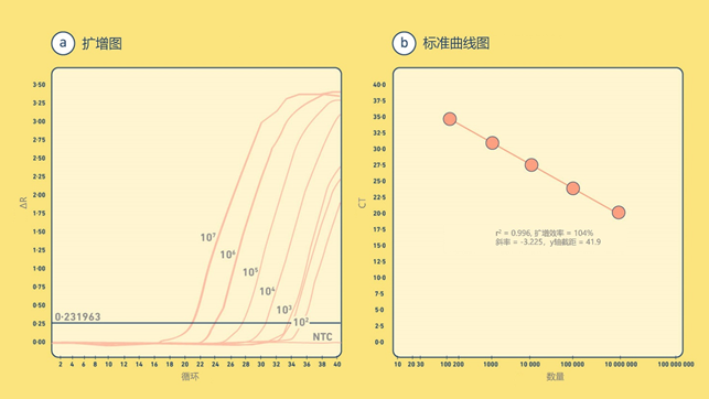 图3 | qPCR扩增图和标准曲线示例,用于对未知样本的拷贝数进行量化。