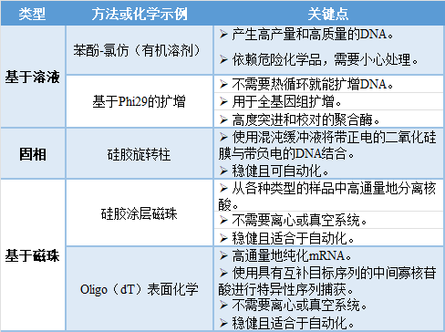 传统的第二代测序(NGS)样品制备方法可能是劳动密集型的,需要有经验的实验室人员仔细处理样品,以产生高效和可靠的测序结果。最近几年,有几种样品制备的方法得到了发展和调整,目的是提高速度、产量和可重复性。 其中许多方法也或多或少地与自动化兼容,提供了将人为错误和变异最小化的机会,并进一步提高不同批次样品之间的一致性。 1、NGS工作流程中对样品产量的需求 样品吞吐量是高通量测序实验室样品制备的一个关键因素,对生产力和成本效益有直接影响。 2、什么是样品吞吐量? 样品处理量是指同时(平行处理)或在特定时间范围内(每天、每周或更长时间)处理的样品数量。 NGS应用有不同的吞吐量要求。小规模/低通量的样品制备,如小型学术研究项目,通常可以通过人工处理来管理,而高通量的应用可能需要一定程度的自动化,取决于格式、规模和可用的设备选项。 各种规模的自动化加样设备可以实现NGS样品制备和NGS文库制备步骤的自动化,提供必要的速度、产量和可重复性,同时将人为错误的风险降到最低。在临床诊断等关键应用中,这种可靠性可以减少低质量数据的风险,以及对珍贵样本重复制备和测序的需要。 随着测序在临床应用中的加速采用,解决样本吞吐量这一工作流程中的潜在瓶颈的重要性正在增加,比如癌症诊断,早期和可靠的诊断能影响患者的长期预后。 基因组测序公司现在为基因测试提供公共和私人NGS服务。为了保持成本效益,这些公司需要保持高的样本吞吐量,每天处理大量的NGS样本,让他们的测序系统忙于搅动数据。 3、NGS样品预处理和文库预处理之间的区别 在NGS工作流程中的样品采集和测序之间,有两个关键阶段:样品制备和文库制备,每个阶段都包含一系列的步骤(图1)。 图1 | 从样品采集到测序和分析的典型NGS工作流程。样品制备方法可以有很大的不同,这取决于起始材料的来源、数量和质量。 NGS样品制备包括提取核酸的具体步骤,如从福尔马林固定、石蜡包埋(FFPE)人体组织样品中提取基因组DNA。例如,这些FFPE样本可能需要一个额外的步骤来修复受损的DNA,使其适合测序。 样品制备还可以包括一个扩增步骤,将核酸片段的数量增加到足以用于文库制备和测序仪器的水平。 文库制备从样品制备中获取纯化和扩增的核酸(DNA或RNA),并通过添加测序条形码和适配体将它们处理成最佳长度。在某些情况下,基于杂交或PCR的富集步骤通过富集感兴趣的特定区域进一步优化了测序库。 4、NGS样品制备的不同方法 有各种技术和方法可用于NGS的样品制备。这些方法包括从传统的基于溶液的方案,通过固相和膜化学,到基于磁珠的方法。 基于磁珠的方法可以说是固相萃取的一个子类别,但有许多化学方法是可能的,而且工作流程很独特,完全可以作为一个单独的类型来考虑。 这些方法中的每一种都遵循DNA(或RNA)分离的三个基本步骤: ➤ 裂解样品中的细胞,从温和的洗涤剂到积极的均质处理; ➤ 清除污染物,包括不需要的核酸和变性的蛋白质; ➤ 将核酸回收到适当的缓冲液中,用于任何下游的应用。 表1列出了这些技术和NGS样品预处理的几种方法。 表1 | NGS样品制备的技术和方法概述 5、基于溶液的样品制备方法 最著名和最广泛使用的基于溶液的核酸分离方法可能是苯酚-氯仿DNA提取。虽然这种方法使用了危险的化学品,但如果处理得当,它能以较低的成本获得高质量的DNA。这种方法在研究实验室中很常见,学生和博士后研究人员进行苯酚-氯仿提取是日常工作的一部分。 然而,这种方法对高通量应用并不那么适用。它需要仔细处理,并可能有苯酚(一种抑制剂)的携带。此外,尽管现代自动化加样设备相当复杂,但它们无法判断并实现样品间产量和纯度的平衡,而这是研究人员特别关注的一点。 因此,基于苯酚-氯仿的样品制备更适合于低通量、高产量的需要,而不是测序实验室所要求的高纯度或高通量。 另一种更适合自动化的基于溶液的方法涉及基于Phi29 DNA聚合酶的DNA扩增。这种方法使用一个管子、一个温度的格式忠实地扩增有限的样本,比如来自单细胞的样本。 高保真度的Phi29 DNA聚合酶在30℃下仍有活性,不需要热循环,并能从几pg的起始材料中产生微克的DNA。Phi29依赖于等温扩增,可用于环状(或环化)DNA模板和线性DNA模板(图2)。 图2 | 基于Phi29 DNA聚合酶的扩增原理。模板DNA在多个位置用随机六聚体做引物。然后Phi29 DNA聚合酶扩展引物,复制模板并置换任何下游的扩展引物。链式置换和随后的引物导至新模板呈指数级增长,用于等温扩增。 使用Phi29聚合酶的商业试剂盒,如Genomiphi™和TempliPhi™ DNA扩增试剂盒,是为使用简单的自动化友好方案来减少动手时间而设计的。这些类型的试剂盒还可以提供单管或多孔板预分配试剂的选择,使它们适合一系列的吞吐量需求和液体处理系统。 6、固相DNA分离 固相法提取DNA依赖于带正电的二氧化硅和带负电的DNA之间可靠的化学作用。一个典型的方案是使用混沌盐来破坏链间的氢键,促进核酸磷酸残基吸附在硅膜上。 这种二氧化硅与DNA的结合是可预测的,而且很容易调节,使碎片和潜在的污染物被洗掉,纯化的DNA以高产量和高纯度洗出(图3)。 与基于溶液的同等方法,苯酚-氯仿萃取相比,二氧化硅旋流柱需要更少的移液步骤,而且所有的步骤都可以在同一个容器中进行。这些特点使得使用二