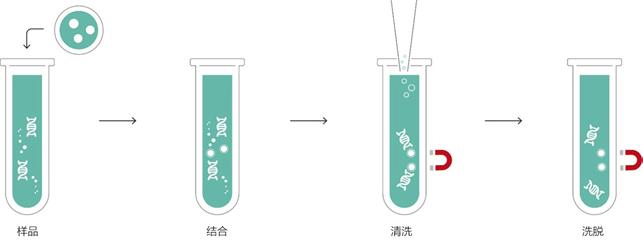 对核酸进行分析是一种强大的实验方法,它为基础研究和临床应用提供了对各种生物过程的洞察力。DNA分离(以及RNA分离)是许多现代基因组学技术开发和应用的第一步,它需要没有污染物的高质量起始材料。 复杂,这是我们谈到核酸提取时最重要的问题,也是核心问题。因此,为你的样品或应用选择“正确”的分离方案是很重要的。 如何提取DNA(或RNA)? 基因组DNA提取是许多分子生物学研究和所有重组DNA技术的第一步。该方案涉及到将细胞破碎,并把需要的DNA从样品中其他核酸和细胞成分中分离出来,同时还要保持其良好的状态以便进行下游分析。 有几种提取方法可供选择,从温和的到积极的,如何选择取决于各种因素,如目标DNA、源生物体、起始材料的类型和质量以及应用。所有的方法都有三个共同的步骤:裂解、去除污染物和DNA回收。 步骤1,裂解 细胞裂解包括化学、机械或酶法破坏细胞膜和蛋白质的变性。具体方法取决于你的起始材料。细菌、哺乳动物细胞、植物细胞和人体组织都可能需要一个稍微不同的方法。 温和的裂解方案可能涉及使用洗涤剂,如十二烷基硫酸钠(SDS),或酶来打破细胞膜;积极的裂解方案可能采取均质化的形式来物理地打破细胞壁。 步骤2,去除污染物 你可以使用基于溶液和固相的方法,将DNA从不需要的裂解碎片和潜在的污染物中分离出来。例如,苯酚-氯仿DNA提取法将水溶性DNA和变性蛋白质分离到不同的阶段。这很便宜,但速度很慢,而且有可能出现影响下游应用的苯酚残留。 固相萃取将DNA结合到柱子或珠子表面。例如,二氧化硅树脂或二氧化硅包覆的磁珠,使用混沌盐来破坏氢键并结合核酸,使污染物被洗掉。寡核苷酸涂层树脂也可以增加一定程度的特异性,但柱子套件的成本会迅速增加。 步骤3,回收目标DNA 下游应用需要你的DNA有一个合适的溶剂和浓度。通常情况下,这只是用乙醇沉淀你的DNA,清洗,然后重新悬浮在适当的缓冲液中。对于固相方法,首先需要调整缓冲液的pH值或盐浓度以释放核酸。 特定样品DNA分离的挑战 5.1、培养的哺乳动物细胞和组织 培养细胞相对容易用渗透压或洗涤剂处理来裂解,而从组织中分离DNA需要打破细胞外基质,而不仅仅是细胞膜。这通常需要均质化,然后进行硅胶柱(如genomicPrep试剂盒)或基于磁珠(如SeraSil-MagTM)的纯化,或者不太有利的苯酚-氯仿提取。 使用福尔马林固定、石蜡包埋(FFPE)的组织在临床应用和一些研究中很常见。它对保存组织结构非常好,但会引入各种DNA损伤,影响深远。也就是说,由于分离出的DNA的质量直接影响到检测结果,阳性样本可能仅仅因为提取不当而被忽略。 5.2、血液 从血液中提取DNA的一个挑战是DNA数量的变化取决于血液的成分。红细胞不含DNA,所以全血中每个细胞的DNA含量比白膜层或骨髓来源的部分少得多。 血液凝固也带来了挑战,凝结会阻止有效的样品消化,一些抗凝剂会干扰PCR扩增。 5.3、细菌 在从细菌中提取DNA方面,革兰氏阳性和革兰氏阴性样本之间存在差异。革兰氏阳性样本通常需要溶菌酶处理,以消化细胞壁中较高的肽聚糖,而对于革兰氏阴性样本,简单的渗透压冲击可能就足够了。 两种类型的DNA都不可能很少,通常使用快速方法,如碱性提取和硅藻土,来提取DNA。这两种方法都很可靠,但碱性提取本身可能无法提供最高的纯度,而硅藻土的成本可能很高。 5.4、植物材料 植物细胞可以嵌入坚韧的基质中,其细胞壁由糖类和纤维素组成,很难打破。基于溶剂的十六烷基三甲基溴化铵(CTAB)提取方法对于植物材料来说是很常见的,但这是一种积极的方法。它使用苛刻的化学品,很费力,而且经常需要进一步清理和优化不同的样品和应用。 用磁珠提取DNA 磁珠因其多功能性和易用性,为传统的分离和清理方法提供了一个很好的替代方案。它们不需要对可能已经搅拌过的样品进行额外的离心,提高了回收较大片段的可能性,而且可以扩大规模,比色谱柱具有更高的结合能力。 使用磁珠很简单,不需要危险的溶剂,释放DNA或RNA只需调整缓冲液的特性(图1)。这种简单性也使得磁珠很适合在高通量应用中实现自动化。 图1 | 用于核酸分离的磁珠的原理。 |
