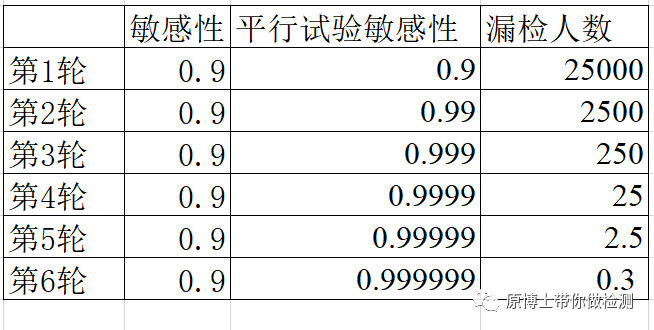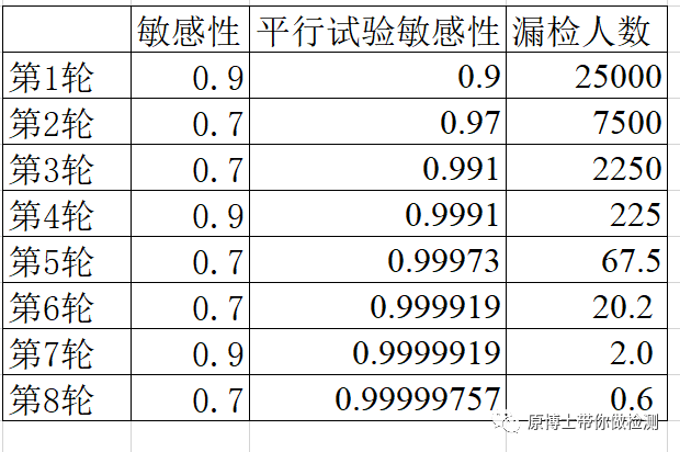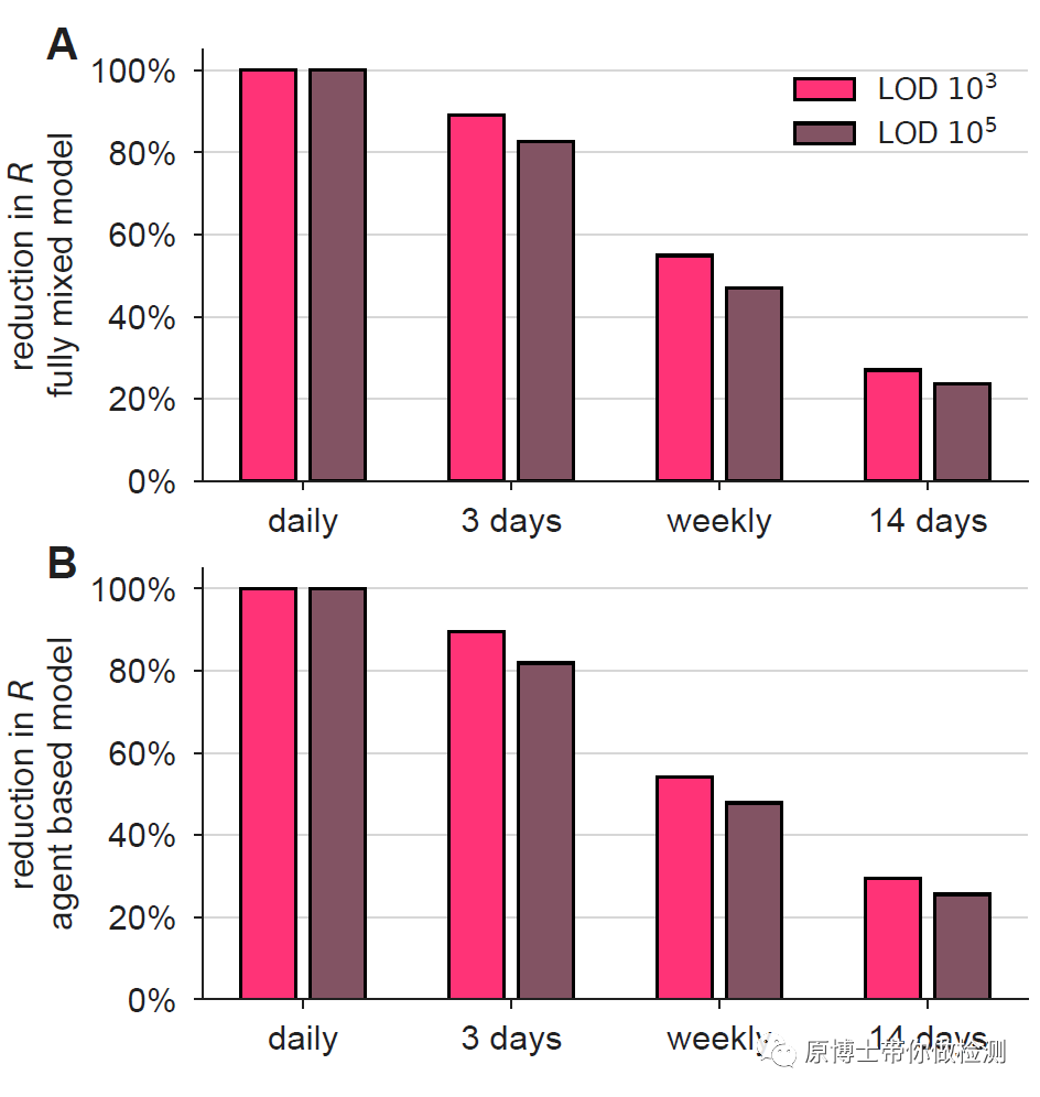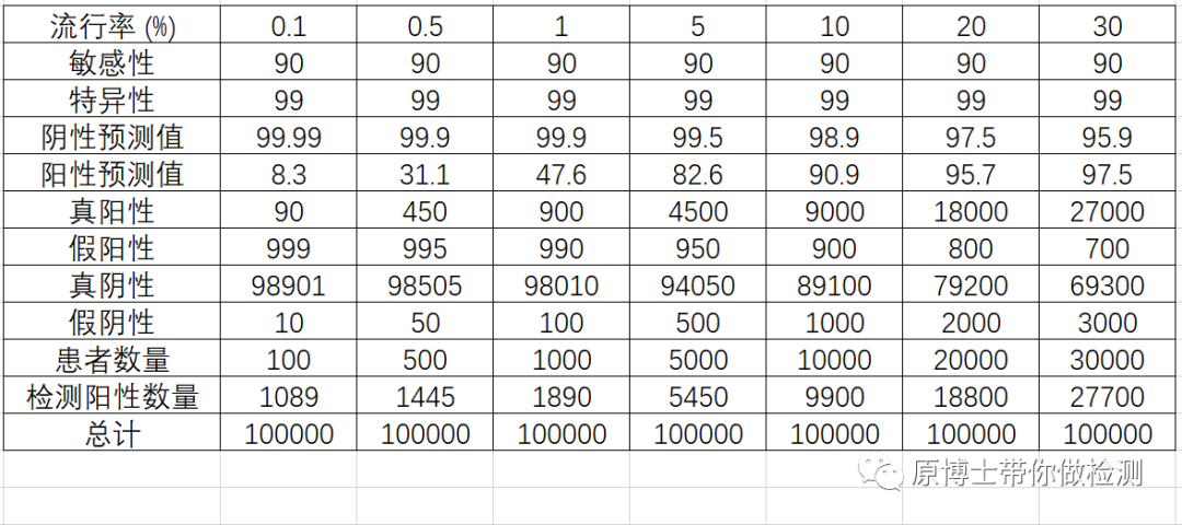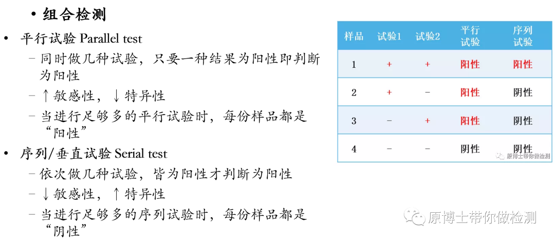 假阴性率(漏诊率β)=1-诊断敏感性,因而诊断敏感性越高,假阴性率越低; 假阳性率(误诊率α)=1-诊断特异性,因而诊断特异性越高,假阳性率越低; 3.“金标准”方法 我们可能经常看到某种方法为金标准方法,比如核酸检测经常被用于胶体金试剂评价的金标准方法,金标准方法只是相对某种方法更准确的方法,金标准方法仍然无法达到100%,也仍然会产生假阳性或假阴性。 补充阅读:新冠抗原检测不适合普通人群的数学解读 二、流行率 或者称为感染率, 阳性预测值PPV:在检测的阳性结果中真正为患病群体的比例。 阴性预测值NPV:在检测的阴性结果中真正为健康群体的比例。 由于检测方法的敏感性和特异性是一个诊断试验的内在属性,是不会随着流行率的变化而改变。 当流行率增加时,阳性预测值增加而阴性预测值减小,假阳性降低,假阴性增加; 当流行率减小时,阳性预测值减小而阴性预测值增加,假阴性降低,假阳性增加. 例如在10万人口中,COVID-19流行率为0.1、0.5、1、5、10、20、30%,敏感性和特异性分别为90%/99%时的阳性预测值(PPV)和阴性预测值(NPV)以及检测结果为真阳性(TP)、假阳性(FP)、真阴性(TN)和假阴性(FN)的数量。 补充阅读:全球新冠抗原检测试剂的性能评价概要 三、检测策略 1.平行试验Parallel test 进行多重试验时,至少有一种试验结果是阳性就认为该个体为阳性.在疾病流行率一定的情况下,采用平行策略会增加诊断试验的敏感性,从而使得阴性预测值升高;使得特异性和阳性预测值降低.当采用这种策略时,可能会使得健康个体被误诊即假阳性。 2.序列/垂直试验Serial test 进行多重试验时,必须得所有试验结果为阳性才能认为个体为阳性.在疾病流行率一定的情况下,采用垂直策略会增加诊断试验的特异性,并使得阳性预测值升高;使得敏感性和阴性预测值降低.当采用这种策略时,可能会使得发病个体被漏检即假阴性。 假设一个城市的人口为2500万,真实流行率为1%,则该城市有25万感染者。如果按照抗原检测平均敏感性为70%,荧光定量PCR核酸检测的敏感性为90%。 策略1:连续进行核酸检测,需进行6轮检测,漏检人数小于1 策略2:1次核酸2次抗原检测交替进行时,先做核酸的情况下需进行3轮核酸和5轮抗原共8轮检测,漏检人数小于1。 四、检测时间间隔 采用“检测-隔离”策略,通过将检测阳性群体进行隔离减少感染人数降低R0,通过两种模型计算2种LOD方法,不同检测间隔对R0的降低。每天检测可将R0降至0,每3天检测可将R0降低80-90%,每周检测则R0降低约50%。 因此检测间隔越长,“假阴性”的比例越高,这里的假阴性并非方法学引起,而是病毒继续在人群中传播引起的多次检测结果不一致的“假阴性”。 补充阅读:大规模群体筛查的六个要素! 五、服从“检测-隔离”人群的比例 “检测-隔离”策略的基本原理是降低R0,以下公式中主要的影响因素有: φ:服从隔离政策人群的比例; f0:无检测策略下(自我)隔离感染人数的比例 ftest(se):检测隔离的感染人数的比例(包含自我隔离) 如果大家都不服从隔离政策φ=0或者检测方法无效,ftest(se) = f0,则R=R0,“检测-隔离”策略失败; 如果参与隔离策略的人群比例为100%,则φ=1,R与以下公式有关, 如果感染者都能服从检测并进行隔离则ftest(se)=1,R=0,传染可被完全阻断; 因此“检测-隔离”策略成功的关键是大部分人参与检测,阳性隔离,如果有感染者不进行检测在人群中继续传播病毒,则也会引起“假阴性”,这里的假阴性并非方法学引起,而是病毒继续在人群中传播导至多次检测结果不一致的“假阴性”。 补充阅读:大规模群体筛查的六个要素!