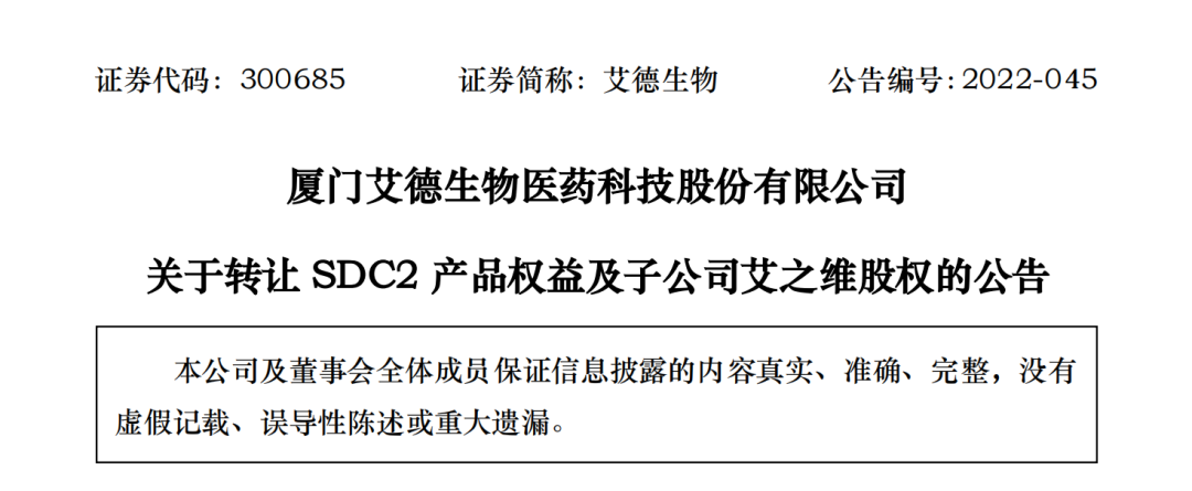 6月2日,厦门艾德生物发布《关于转让SDC2产品权益及子公司艾之维股权的公告》,将SDC2产品所有权及相关的知识产权以及生产、商业化SDC2产品相应的经济权益,作价1亿元,同时将控股子公司上海艾之维的80%股权,作价0元,全部转让给杭州艾维克生物。 人类 SDC2基因甲基化检测试剂盒(荧光PCR法)是厦门艾德生物于2021年获批的肿瘤早测产品,艾德官网显示,畅青松™是其自主研发的一种无创、便捷、准确的肠癌早测产品,其通过检测粪便中SDC2基因甲基化水平,可以辅助诊断出肠癌以及处于“黄金早诊阶段”的腺瘤、息肉等癌前病变。 IVD从业者网检索发现,目前国家药监局批准的SDC2基因相关的检测产品仅有4款,在肠癌检测领域,SDC2基因甲基化检测是目前关注度比较高的技术之一。首先是韩国团队2014年4月以SDC2基因为靶标,率先在韩国FDA注册了第一款甲基化检测肠癌的产品EarlyTect™-Colon,随后我国康立明公司2018年在中国FDA注册了同类产品长安心,接下来,便是艾德公司2021年获批的畅青松,还有华大基因公司华常康也是以SDC2为靶标。除此之外,锐翌生物SDC2和其他基因联合检测肠癌的产品也拿到了注册证。