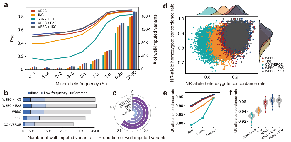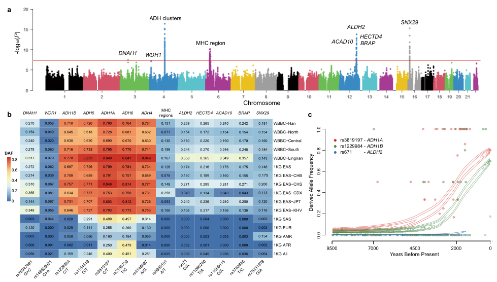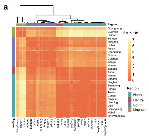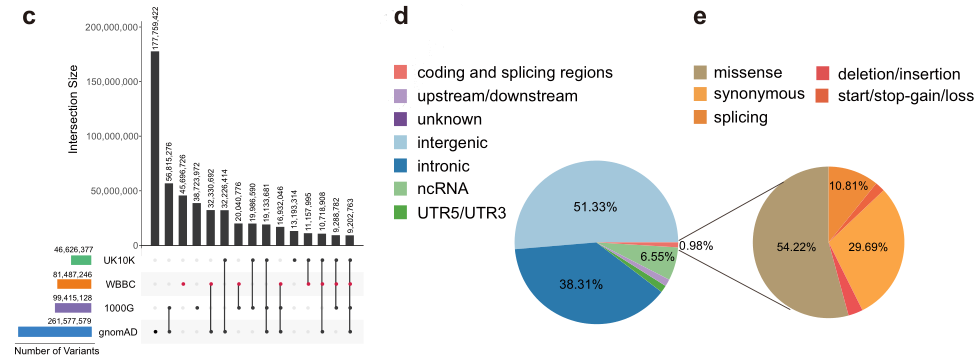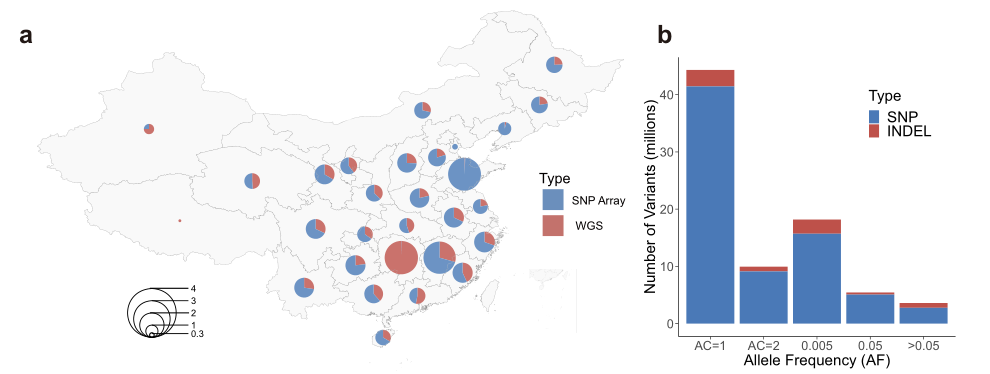 了解人类基因组的结构是实现精准医疗的基本途径。在过去十年中,在解开复杂性状/疾病的遗传基础和人类进化史方面取得了巨大进展。对具有不同祖先的全球人群进行深入分析,可以提高对基因组变异与人类疾病之间关系的理解。然而,基因组研究在全球人口中存在着巨大的不平衡,欧洲血统的个体约占所有全基因组关联研究参与者的79%。同样,大部分全基因组测序(WGS)工作主要针对欧洲人群,如荷兰、英国和冰岛人群。即使在更大的基因组项目中,如由来自80多个不同研究的约155k名参与者组成的TOPMed(Trans-Omics for Precision Medicine)项目,也只有9%的样本是亚洲人后裔。因此,需要大规模的基因组数据来了解亚洲人群的遗传基础。最近,一些研究对包括日本人、韩国人和中国人在内的亚洲人群进行了排序和分析。新加坡SG10K试点项目报告了4810份全基因组测序样本,包括903名马来人、1127名印度人和2780名中国人,GenomeAsia 100K项目的试点研究提供了来自亚洲不同国家1267名个体的数据集。 尽管做出了上述努力,但中国人口在人类基因研究中的代表性仍然不足。中国作为人口最多的国家,是一个多民族国家,其中汉族占人口的90%。全国共有34个行政区划,包括省、市、特别行政区。研究团队之前的研究表明,即使有包含64976个人类单倍型的单倍型参考panel,中国人口的基因型填充也无法达到最高精度,仍然需要一个特定于人口的参考panel。对中国人口的遗传研究有可能使约20%的世界人口受益,并与世界其他地区进行比较。 近日,来自中国的研究团队在杂志Nature communications上发表了一篇题为“Genomic analyses of 10,376 individuals in the Westlake BioBank for Chinese (WBBC) pilot project”的文章。研究团队启动了中国西湖生物银行(WBBC)项目,以在大规模队列中描述基因组变异和群体结构,收集约100000个具有深层表型的样本。本文描述了中国34个行政区中的29个行政区10376个样本的WBBC试点项目的基因组发现。研究团队提供了一个基于中国人群的参考panel,可以显著改善中国人口的基因型填充性能,尤其是对于低频和罕见变异。通过分析WGS数据,研究团队发现SNX29、DNAH1和WDR1基因中存在选择特征,酒精代谢基因的衍生等位基因(ADH1A和ADH1B)大约出现在7000年前,在4000年前的东亚更为常见。遗传证据支持秦岭-淮河线和南岭山脉的相应地理边界,这将汉族划分为不同亚群,同时,研究团队发现北汉族比南汉族更同质。 图片来源:Nature Communications 主要内容 WBBC试点数据集和基因变体。 WBBC试点项目从中华人民共和国34个行政区划中的29个行政区划中抽取了10376人(图a)。研究团队在NovaSeq 6000平台上对4535人进行了WGS。在去除污染和重复样本后,保留了4480个人进行下游分析和统计。平均测序覆盖率为13.9×,覆盖99.77%的基因组。此外,6025名个体通过高密度Infinium Asian Screening Array(ASA)进行了基因分型,其中184名个体也进行了全基因组测序。 研究团队从10396万个原始变异体中筛选出81498995个变异体,包括74118191个单核苷酸变异体(SNV)和7380804个插入和缺失(INDEL)。将WBBC中确定的变体与其他现有数据库进行比较,有45696726个变体在1000基因组计划(1KG)、gnomAD 或UK10K 中不存在(图c),其中绝大多数为罕见变异。 WBBC中样本统计数据。 图片来源:Nature Communications 变体注释和个体基因组。 为了描述这些变体的生物学特征,研究团队使用ANNOVAR工具对4480名个体的所有变体进行了注释。对于未在dbSNPBuild151中的变异,内含子区和基因间区的变异分别占38.31%和51.33%。只有0.98%的变体位于编码和剪接区域(图d)。错义变异体占编码区和剪接区变异体的54.22%,剪接变异体占变异体的29.69%(图e)。 WBBC中变体的统计数据。 图片来源:Nature Communications 基因组单态密度评分分析。 单态密度评分(SDS)可用于推断最近的等位基因频率变化。研究团队试图通过基于4334名全基因组测序结果推断中国汉族人群SNV的最新等位基因频率变化。结果显示在染色体16p上的SNX29基因(图a)中发现了一个重要的选择标记,该基因编码sorting nexin-29蛋白,并在肾脏、淋巴结、卵巢和甲状腺组织中广泛表达。SNX29基因上30多个SNP表现出强烈的选择特征,这表明该基因组区域的选择显著富集。研究团队还确定了其他两个潜在选择信号,3号染色体上DNAH1和在4号染色体上WDR1(图a)。DNAH1基因的多态性显示出与中国男性不育的潜在关联,而WDR1基因的变异是中国人群痛风发生的危险因素。研究团队还确认了其他几个重要自然选择信号,酒精脱氢酶(ADH)基因簇,主要组织相容性复合体(MHC)区域和ALDH2(图a)。这三个选择特征区域也在日本人群中被发现。酒精代谢酶,如ADH基因(包括ADH1A、ADH1B、ADH4、ADH5和ADH6)和乙醛脱氢酶(ALDH2)基因,对酒精代谢途径和随后的酒精中毒保护作用有着有效的影响,这强烈表明了不同种族特定的酒精消费模式。 SDS分析中国汉族人群全基因组近期选择特征。 图片来源:Nature Communications 中国人口基因型填充参考panel。 研究团队评估了中国人群中WBBC、1KG、CONVERGE和两个组合panel(WBBC+EAS和WBBC+1KG)的基因型填充准确性。结果表明,WBBC的中国样本数几乎是1KG项目的15倍,大大改善了低频和罕见变异的填充(图a)。两个组合panel,WBBC+EAS和WBBC+1KG,具有最高的R平方(Rsq)和变体数量,其次是WBBC,1KG和CONVERGE(图a)。总体而言,研究团队采用Rsq和NR等位基因一致率来衡量五个panel的基因型填充准确性。结果