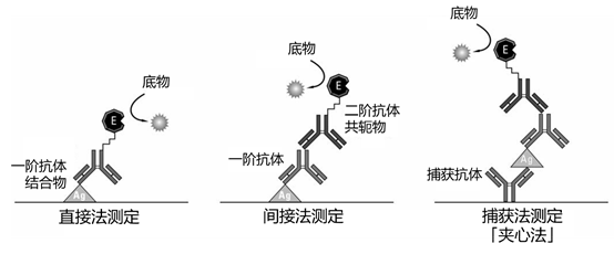 酶联免疫吸附测定(ELISA)是一种检测和量化复杂混合物中特定蛋白质的强大方法。该方法最初由Engvall和Perlmann(1971年)描述,使用特异性抗体可以分析包被在微孔板孔中的蛋白质样品。该技术已经彻底改变了免疫学,并在医学研究实验室中普遍使用。ELISA也有商业应用,包括在诊断和食品行业检测疾病标志物及过敏原。 ELISA方法之所以成为可能,是因为一些相关领域的科学进步。Kohler和Milstein(1975年)开发的生产抗原特异性单克隆抗体技术,可以使这些抗体被用作探测复杂蛋白质混合物或组织样品中单个分子的探针。 最初,检测是通过使用放射性同位素标记的抗体的放射免疫测定来实现的,但由于健康风险,人们寻求替代方法。Avramais(1966, 1969)和Pierce(1967)开发了将抗体与生物酶进行化学连接的方法,这些酶的活性在含有适当底物的溶液中产生可测量的信号。随着荧光技术的发展,使用荧光体标记的抗体产生信号也变得很普遍,特别是在多重阵列中。 尽管ELISA的许多变种已经被开发出来并用于不同的场合,但它们都依赖于相同的基本要素: 1. 包被/捕获:直接或间接将抗原包被在聚苯乙烯微孔板的表面。 2. 板封闭:加入不相关的蛋白质或其他分子以覆盖微孔板孔的所有不饱和表面结合点。 3. 探针/检测:用与抗原亲和结合的抗原特异性抗体进行孵化。 4. 测量信号:检测通过特异性抗体上的直接或二阶标签产生的信号。 在一个典型的旨在检测复杂蛋白质混合物中的抗原的检测中,抗原通过直接吸附或通过吸附在微孔板孔中的抗体被包被下来。板被封闭,抗原被特定的检测抗体探测。检测抗体可以直接用产生信号的酶或荧光基团标记,也可以用酶或荧光标记的二阶抗体(或Avidin-生物素化学)进行二次探查。 对于酶法检测,加入适当的酶底物。观察到的信号与样品中的抗原量成正比。两步之间的清洗确保只有特异性(高亲和力)的结合被保持下来,从而在最后一步引起信号。 图1 | ELISA方法示意图 |