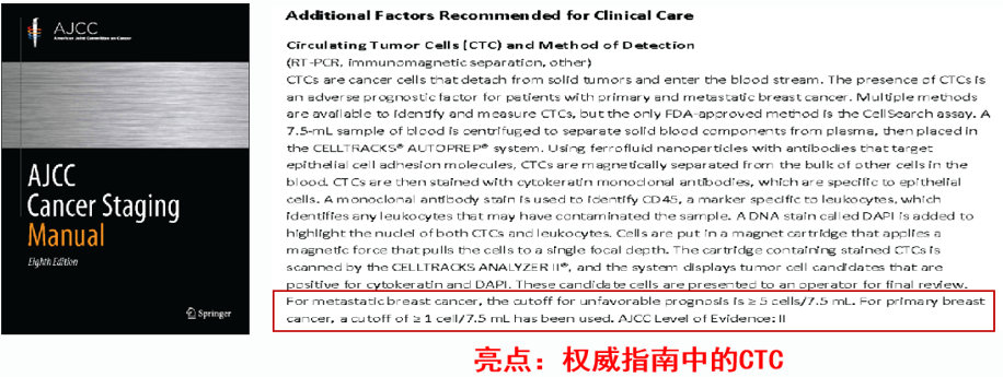 2018年全球启用的AJCC第八版TNM分期系统中,除保留c M0(i+)分期外,更进一步明确了CTC检测的临床价值。最新指南将CTC列为继ER/PR ,HER2,Ki67和肿瘤组织学分为四项生物学指标之后的又一项乳腺癌预后评估工具,认为乳腺癌外周血中存在CTC提示预后不良。