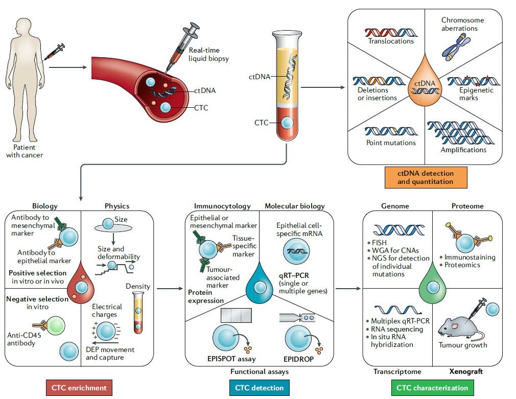 CTC可作为分析患者肿瘤生物学特征的样本,认为CTC有助于及时发现肿瘤的生物学变化,并为及时调整治疗方案提供参考,从而实现实时、个体化治疗,是目前具有发展潜力的肿瘤无创诊断和实时疗效监测手段。