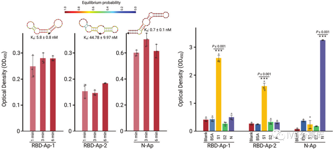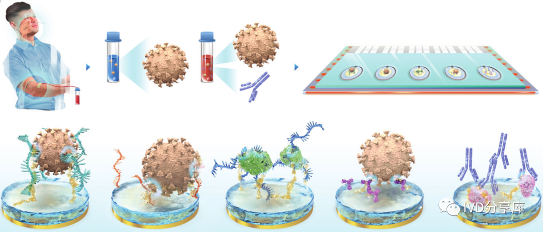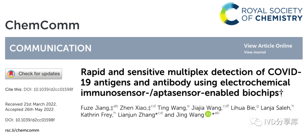 近日,期刊Chemical Communications (2020年影响因子:6.222,五年影响因子:6.008)在线刊登苏州系统医学研究所张连军研究团队联合瑞士苏黎世联邦理工学院王京研究团队的研究成果(Rapid and sensitive multiplex detection of COVID-19 antigens and antibody using electrochemical immunosensor-/aptasensor-enabled biochips), 详细报道了可快速、灵敏、多重检测新冠病毒抗原和抗体的电化学生物传感器阵列。 新冠病毒抗原检测的主要生物标记物是尖峰蛋白(S)和核衣壳蛋白(N),S蛋白包含两个亚基—S1和S2。S1蛋白包含一个独特的受体结合域(SRBD),可与人血管紧张素转换酶2(ACE2)特异性相互作用,进一步介导宿主细胞识别。SRBD是开发新冠病毒特异性识别传感探针的理想目标。N蛋白是新冠病毒最丰富的结构蛋白,并且它显示出很强的免疫原性,通常作为新冠病毒检测的生物标志物。 图1. 新型冠状病毒结构 下图所示为电化学生物传感器阵列的渲染图,其中包含多个独立的传感器。根据工作电极上包被生物标记物的不同,传感器分为电化学免疫传感器-electrochemical immunosensor和电化学核酸适配体传感器-electrochemical aptasensor。 图2. 可多重检测新冠病毒S蛋白、N蛋白及IgG抗体的电化学生物传感器阵列方案 对于电化学免疫传感器,选择新冠病毒S1-IgG抗体和S1蛋白作为传感器识别元件,分别识别拭子样本中的S1蛋白和血液样本中的S1-IgG抗体。 对于电化学核酸适配体传感器,通过SELEX方法筛选的两个S1蛋白特异性核酸适配体(RBD-Ap-1、RBD-Ap-2)和一个N蛋白特异性核酸适配体(N-Ap),将其固定在传感器上,以捕获S1蛋白和N蛋白。 图3. (左)ELISA评估核酸适配体与新冠靶抗原的结合时间、最小自由能二级结构和核酸适配体的解离常数(Kd);(右)核酸适配体的交叉反应性验证 一、电化学免疫传感器 Electrochemical immunosensor 将S1-IgG抗体和S1蛋白共价固定在金纳米颗粒丝网印刷电极(AuNP-SPE)表面,制备电化学免疫传感器。传感器表面修饰步骤如下: 1、在工作电极上滴加20μl 10 mM半胱胺(巯基乙胺,cysteamine)溶液以引入-NH2基团,孵育2小时后,使用PBS-T缓冲液(0.05% Tween 20溶于1×PBS溶液中,pH 7.4)进行表面清洗; 2、将20μl 2.5%戊二醛(在PBS-T缓冲液中制备)溶液滴加到工作电极表面,孵育15分钟后,使用PBS-T溶液清洗;