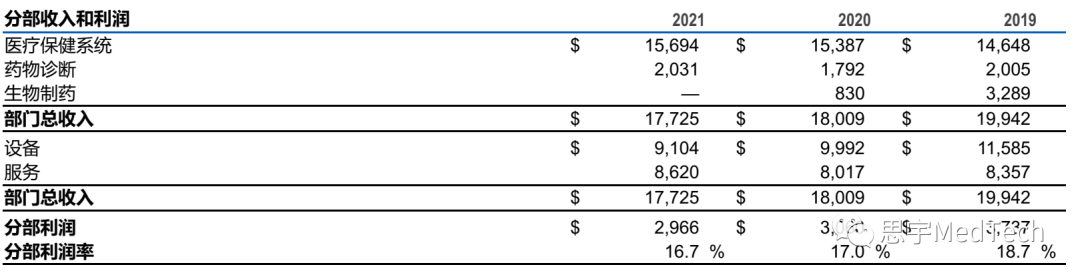 医疗保健系统2021年收入与盈利水平均与2020年持平。其中设备部分,2021年总收入146亿美元,较2020年上升13%,基本回到疫情前水平。 |