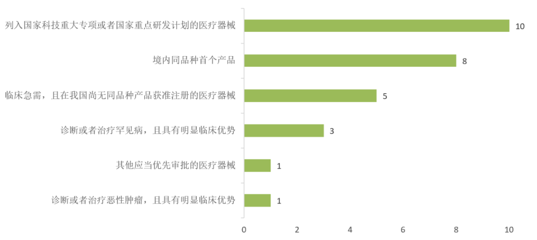 图 1 获证创新IVD产品年度分布 按《医疗器械优先审批程序》和器审中心公开的技术审评报告,把已获证的IVD分成了6小类:诊断或者治疗罕见病,且具有明显临床优势;诊断或者治疗恶性肿瘤,且具有明显临床优势;临床急需,且在我国尚无同品种产品获准注册的医疗器械;列入国家科技重大专项或者国家重点研发计划的医疗器械;其他应当优先审批的医疗器械;境内同品种首个产品。其中排前三的分别是:列入国家科技重大专项或者国家重点研发计划的医疗器械(10款)、境内同品种首个产品(8款)和临床急需且在我国尚无同品种产品获准注册的医疗器械(5款),具体数据见图2。