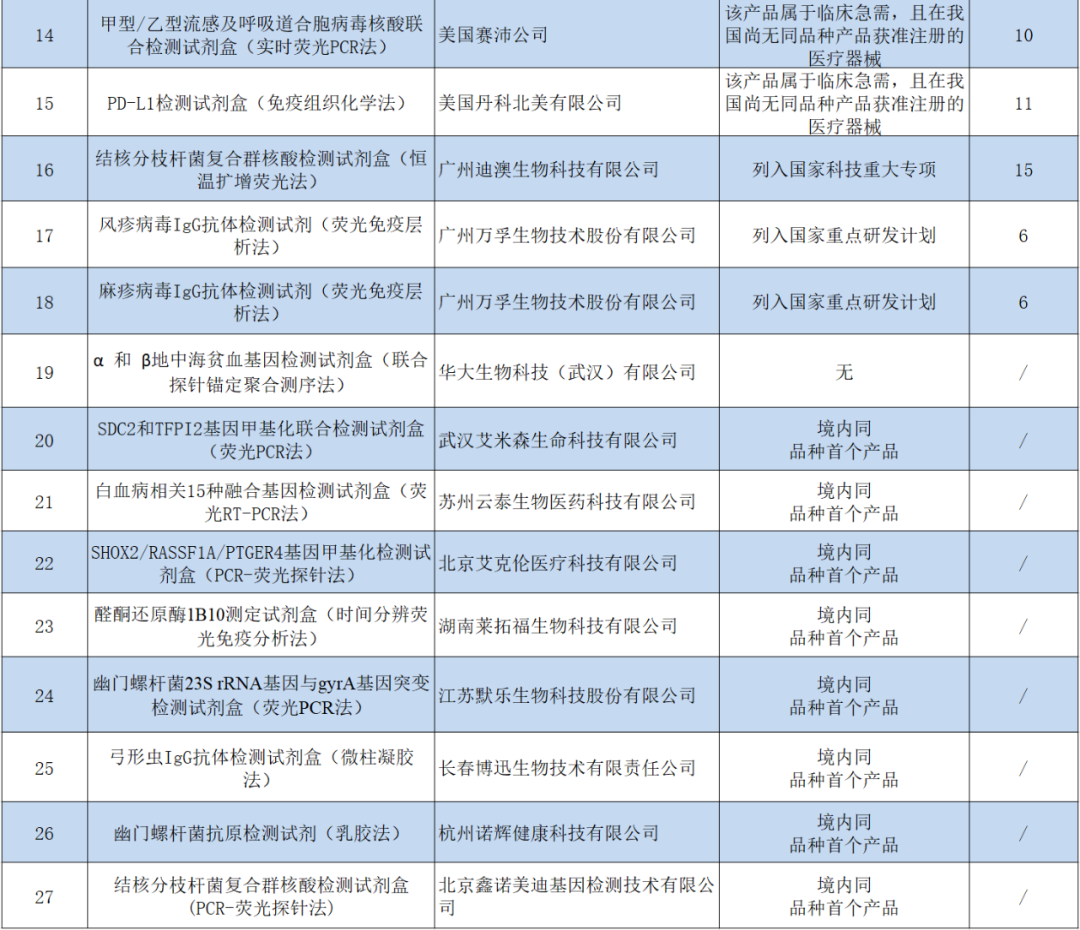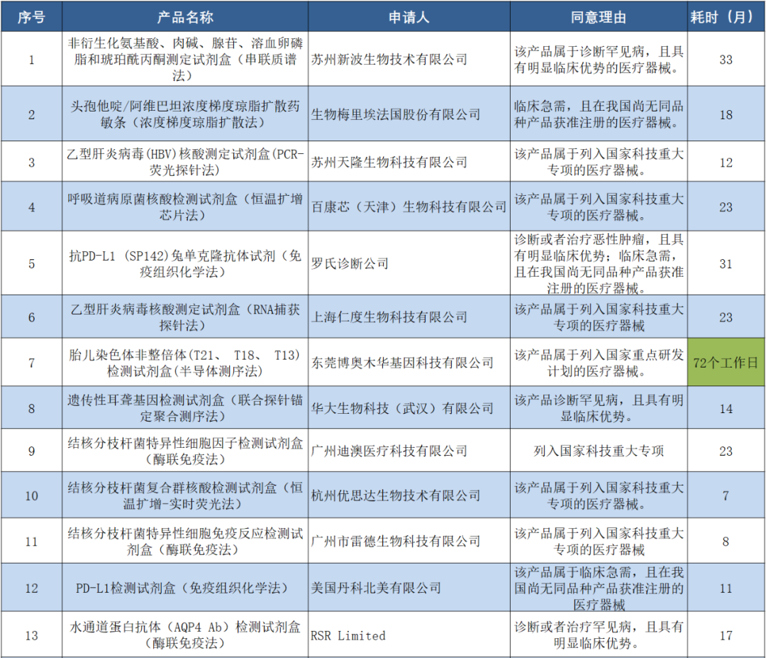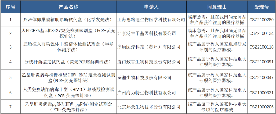二、未获证优先审批的IVD产品 截止到2022年5月13日,还有7款已公示但未获证的优先审批产品,具体数据见表2。未获证可能的原因主要有两个:第一,产品还在技术审评或发补阶段(疫情期间临床试验难度加大);第二,是申请人基于其他因素不再进行优先审批或调整产品。 表 2 未获证优先审批IVD产品列表 三、如何申报优先审批 适用情形 对符合下列条件之一的境内第三类和进口第二类、第三类医疗器械注册申请实施优先审批: (一)符合下列情形之一的医疗器械: 1. 诊断或者治疗罕见病,且具有明显临床优势; 2. 诊断或者治疗恶性肿瘤,且具有明显临床优势; 3. 诊断或者治疗老年人特有和多发疾病,且目前尚无有效诊断或者治疗手段; 4. 专用于儿童,且具有明显临床优势; 5. 临床急需,且在我国尚无同品种产品获准注册的医疗器械。 (二)列入国家科技重大专项或者国家重点研发计划的医疗器械。 (三)其他应当优先审批的医疗器械。
