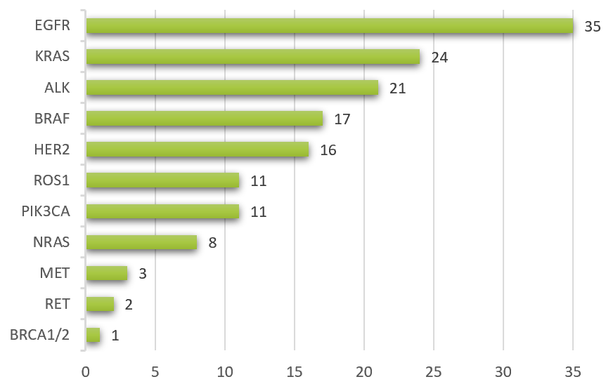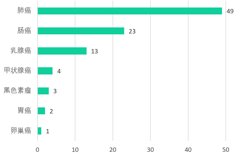 主要涉及7种肿瘤:肠癌,肺癌、甲状腺癌、乳腺癌、黑色素瘤、胃癌和卵巢癌,具体数据见表2。 表 2 涉及不同肿瘤产品分布