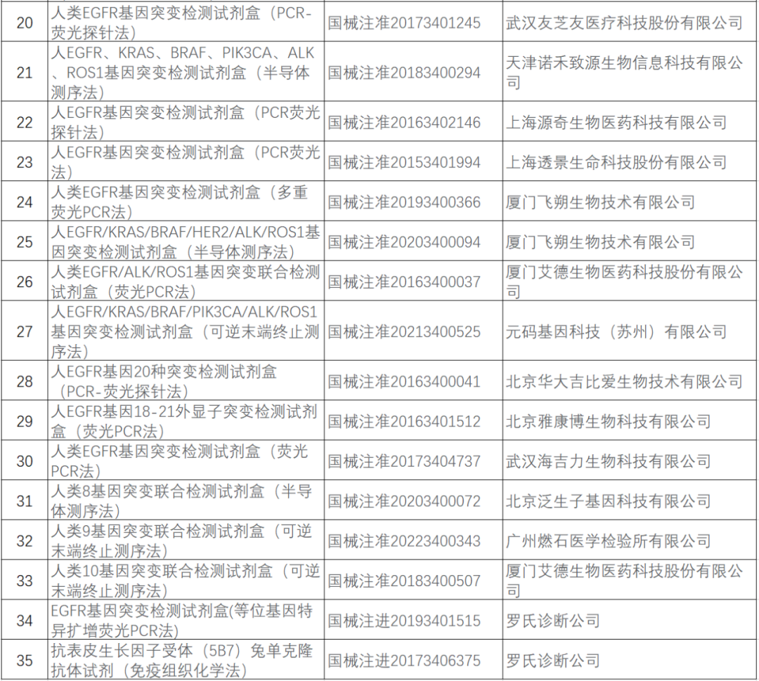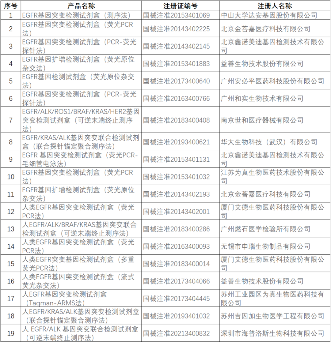 EGFR EGFR 的热点敏感突变包括 19 号外显子缺失突变(19del)及 21号外显子 L858R点突变 ,其他如 20 号外显子 S768I 点突变亦为已知敏感突变。并非所有 EGFR 突变均对所有 EGFR-TKI 敏感,如20 号外显子 T790M 点突变为第一/二代 EGFR-TKI 的耐药突变,但对第三代 EGFR-TKI 奥希替尼敏感。国内检测该基因的获证产品见表3。 表 3 涉及EGFR基因的产品列表 KRAS KRAS 基因是 RAS 基因家族中 3种癌基因之一,为 EGFR 信号通路中一个关键的下游信号分子。KRAS突变可导至 EGFR 抑制剂原发耐药,也是 NSCLC 的不良预后因子。国内检测该基因的获证产品见表4。 表 4 涉及KRAS基因的产品列表