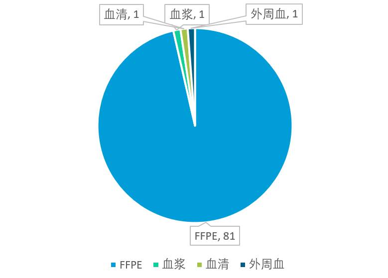 涉及四种样本类型:FFPE、血清(1款产品)、血浆(1款产品)和外周血(1款产品),具体数据见图1(有一款产品样本类型不详)。 图 1 不同产品样本类型分布