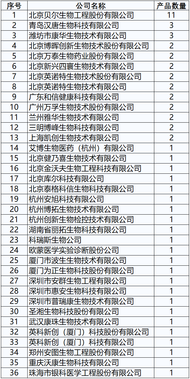 腺病毒是一种人类常见的致病性微生物,NMPA已经批准了60款产品,涉及公司36家公司,境内公司34家,境外公司2家,产品数量排名前三的公司分别为:北京贝尔(11款产品),青岛汉唐(3款产品),潍坊市康华(3款产品)。详细数据见下表(有些含腺病毒的多种病毒联合检测的产品可能不在下面列表中)。