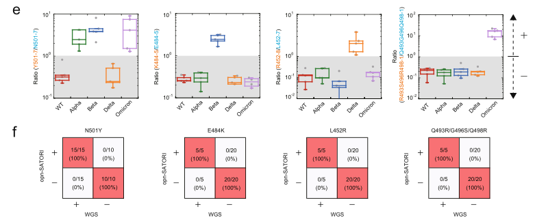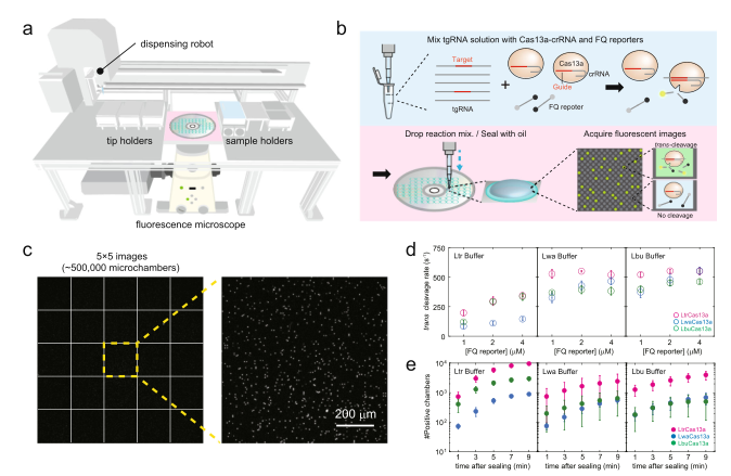 自2019年12月新型冠状病毒SARS-CoV-2传播以来,已经过去了两年多,但感染的发生率并未减少。从公共卫生的角度来看,对感染者进行早期诊断和隔离可有效防止感染的传播。快速、敏感和频繁的检测对于早期诊断很重要。对于SARS-CoV-2感染的诊断,逆转录定量聚合酶链反应(RT-qPCR)由于其高灵敏度(~ 2–20am,(1-10 copies/ul))已被用作“金标准”平台。此外,基于CRISPR的核酸检测方法,如SHERLOCK和DETECTR,由于其高灵敏度(~ 2–20am,(1-10 copies/ul)),相对较短的分析时间(几十分钟),并与紧凑的检测平台兼容亦引起关注。大多数基于CRISPR的方法涉及目标核酸的等温扩增,以及使用Cas12a或Cas13a对扩增的核酸进行荧光或比色读出。扩增步骤对于提高检测灵敏度是必不可少的,但它会延长检测时间(至少几十分钟)。 不久之前,研究团队将基于CRISPR的核酸检测和微反应室技术相结合,开发了一个称为SATORI(基于CRISPR的无扩增数字RNA检测)的无扩增RNA检测平台。SATORI可在5min内检测到单链RNA(ssRNA),如SARS-CoV-2 RNA,分析检测限(LoD)约为5fm(3X103 copies/ul),能够在大多数患者临床标本中快速诊断SARS-CoV-2 RNA感染。然而,当用于高效筛查时,LoD应<10 2copies/ul。此外,SATORI还包含几个手动处理步骤,这些步骤可能会导至人为错误并降低分析精度。 近日,为了解决这些问题,同一个研究团队在杂志Communications Biology 上发表了一篇题为“Automated amplification-free digital RNA detection platform for rapid and sensitive SARS-CoV-2 diagnosis”的文章,在文章中,研究团队开发了SATORI的全自动版本,称为SATORI自动化平台(opn-SATORI)。实验结果证明,opn-SATORI可以在临床标本中检测SARS-CoV-2 RNA,其灵敏度与RT-qPCR相当,并且可以在约9min内区分SARS-CoV-2变体,准确率为98%。 图片来源:Communications Biology 主要内容 “ 自动化平台的开发。 为了自动化SATORI检测流程,研究团队开发了一个RNA检测平台,该平台由三个主要组件组成:compact disk(CD)设备、荧光显微镜和机器人(图a)。基于CD的设备包含约10 8个圆柱形飞升级微反应室。与其他数字检测方法不同,opn-SATORI的CD设备不需要微流控通道中复杂的溶液交换过程,可以以全自动方式完成从样品混合到图像分析(图b)。开发的平台自动启用以下检测过程:(i)通过在试管中将含有预装Cas13a crRNA复合物和荧光猝灭基团标记的ssRNA reporters(FQ reporter)的酶溶液与含有crRNA互补ssRNA靶标(tgRNA)的样品溶液混合,制备反应溶液,(ii)将反应溶液滴入CD装置上的小室,(iii)用一滴油密封小室,(iv)积累来自Cas13a介导的FQ reporter裂解(反式裂解),(v)使用荧光显微镜从约500000个微反应室获取图像,以及(vi)计数荧光(阳性)小室的数量,以量化样本中的tgRNA拷贝数(图c)。整个过程可以自动重复,并且可以使用单个反应分析48个样本。 无扩增数字RNA检测的自动化平台。 图片来源:Communications Biology “ Cas13a的筛选。 为了提高检测灵敏度,研究团队筛选了Cas13a同源序列并优化了缓冲条件。LwaCas13a和LbuCas13a因其强大的反式切割活性而被用于基于CRISPR的核酸检测。此外,LtrCas13a与LwaCas13a和LbuCas13a高度同源,并与LwaCas13a具有类似的抑制细菌生长的作用。结果表明,使用LtrCas13a及Ltr缓冲液时,阳性小室数量最多,且随着tgRNA浓度(300aM–300fM)增高,Ltr缓冲液中阳性小室的数量呈线性增加。在试验开始后约7分钟(油封后3分钟),LtrCas13a检测到SARS-CoV-2的N基因RNA和全基因组RNA,LoD值分别为220和280 aM(1.3×102和1.7×102copies/ul)。鉴于所获得的快速、灵敏和稳健的反式切割活性,LTRCA13A和Ltr缓冲液的组合最适合用于此RNA检测平台。 “ 提高病毒RNA检测灵敏度。 由于平台检测总体积约为15 nL(500000×~30fL)的微室阵列中随机捕获的tgRNA分子,超过99%的tgRNA分子在油封过程中被丢弃,从而导至灵敏度降低。为了克服这一缺点并进一步提高灵敏度,研究团队使用生物素-链霉亲和素磁珠技术在微腔内富集tgRNA分子。将包被链霉亲和素的磁珠添加到含有生物素标记的LtrCas13a crRNA复合物、tgRNAs和FQ reporter的反应溶液中,以捕获磁珠上的LtrCas13a-crRNA -tgRNA复合物,随后将混合物滴到CD设备上,通过磁力将复合物浓缩到腔室中,并用油密封腔室(图a)。该程序在5min内自动完成,与未经磁珠处理的程序相比,阳性小室的数量增加了约50倍(图b),表明LtrCas13a-crRNA-tgRNA复合物在微室中成功富集。在试验开始后约9分钟(油封后3分钟),平台检测到SARS-CoV-2的N基因RNA和全基因组RNA,LoD值分别为2.4和6.5aM(1.4和3.9 copies/ul)(图d)。 Opn-SATORI平台。 图片来源:Communications Biology “ SARS-CoV-2变异毒株的鉴别。 研究团队试图使用opn-SATORI来区分SARS-CoV-2变体。针对相应的变异毒株,即B.1.1.7(α)、B.1.351(β)和B.1.617(δ)中的N501Y、E484K和L452Rspike突变,各设计了20个crRNA,并进行比较筛选。结果显示,在试验开始后约9分钟内(油封后3分钟),WT SARS-CoV-2与每个变体之间的比率存在显著差异,从而能够快速准确地识别SARS-CoV-2变体。不仅如此,B.1.1.529(ο)变体也可以准确区分。总之,这些结果表明,使用opn SATORI和针对特定突变的适当crRNA对可以检测新出现的SARS-CoV-2变体。 SARS-CoV-2变异株的鉴别。 图片来源:Communications Biology “ 临床验证。 研究团队验证了opn-SATORI是否可用于诊断SARS-CoV-2感染。使用靶向N基因RNA的crRNA,研究团队评估了来自Ct值为15–30(10 WT、10 alpha、10 Japan、10 delta和10 omicron变体)患者的50份人类鼻咽拭子衍生RNA样本和来自健康人的10份RNA样本。样品的阳性室数与RT-qPC