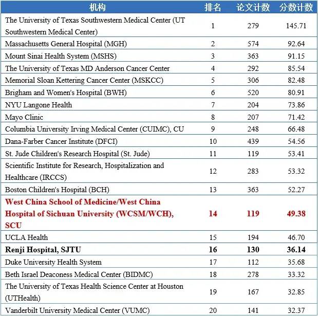 自然指数(Nature Index)最新排名发布,四川大学华西医院凭借高分,位列全球医疗机构第14位,中国医疗机构第1位。 2022年6月 自然指数(Nature Index)最新排名发布,此次数据纳入了2021年3月1日至2022年2月28日期间的统计数据,四川大学华西医院论文计数*得分119,分数计数*得分49.38,位列全球医疗机构第14位,中国医疗机构第1位,本次华西医院在Nature Index排名中再创新高。 据了解,自然指数是依托于全球顶级期刊,统计各高校、科研院所(国家)在国际上最具影响力的研究型学术期刊上发表论文数量的数据库,并且已发展成为国际公认的、能够衡量机构、国家和地区在自然科学领域的高质量研究产出与合作情况的重要指标,在全球范围内有很大影响力。 排名情况 表1自然指数(Nature Index)最新国内医疗机构排名 表2自然指数(Nature Index)最新全球医疗机构排名 成果贡献 在本期排名中,华西医院论文发表贡献度最高的期刊是Advanced Functional Materials,其次为Advanced Materials和Nature Communications。贡献度排名前15的期刊中材料、化学和综合领域期刊占比较高,医学领域期刊数量相对较少。 在nature index纳入的研究产出数据中,华西医院主要包含生命科学、化学和物理学领域,其中生命科学领域论文计数贡献最高,而化学领域分数计数贡献最高。 *论文计数(article count/AC,Count):只要所收录论文有一位或多位作者隶属于某机构或国家,就为该机构或国家增加1个AC分值,其他共同作者不影响计数。 *分数计数(fractional count/FC,Share):一篇文章的FC总分值为1.0。在假定每位文章作者贡献相同的情况下,该分值由所有作者平等共享,分别计入其隶属机构或国家/地区。如果作者有多个隶属机构,那其个人FC分值将在这些机构中再进行平均分配。(原标题为:再创新高!自然指数最新排名华西医院列全球第14、中国第1) |