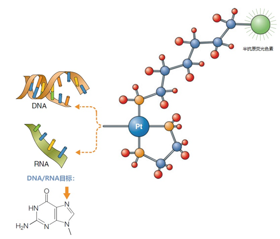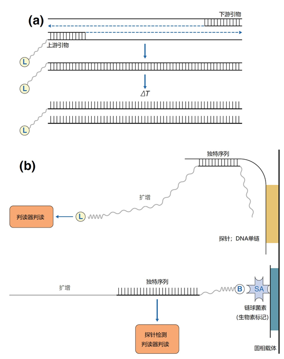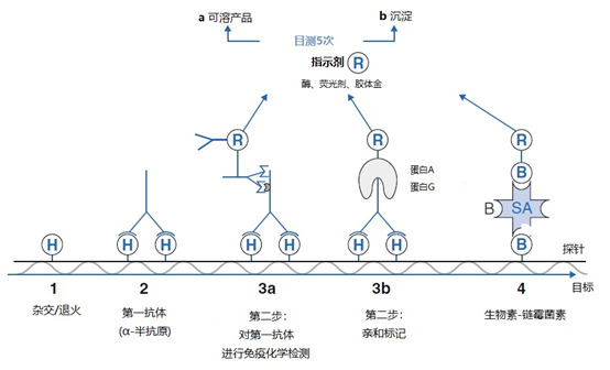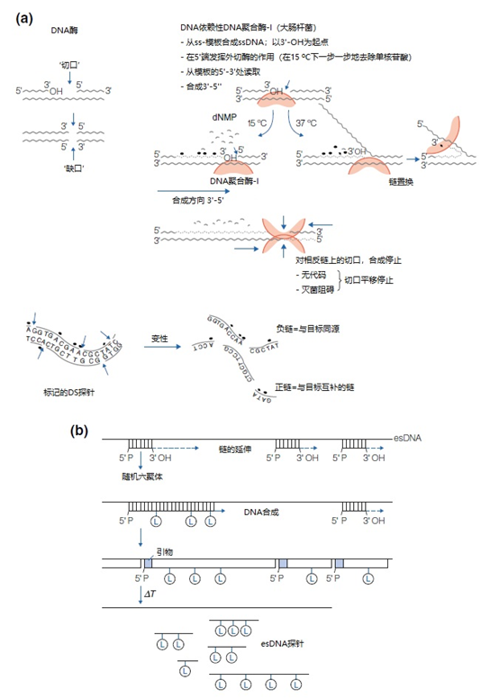 1、标签,杂交和PCR产物的识别和检测 经典的透射电子显微镜已经将杂交可视化(图1)。 图1 | 基因组DNA杂交的可视化,通过透射电子显微镜(TEM)和阴影技术获得 对单链和双链DNA的区分是基于分子的厚度。很明显,探针已经取代了原生DNA。 它可以清楚地看到探针是如何取代原来的互补链的。目前,杂交完全是通过标签来观察的,如果有必要,还可以通过报告基团来观察(见图2)。 图2 | 杂交和杂交探针检测的术语 标记的探针与单链靶点的互补序列杂交,存在于开口线圈形成中。标签本身可以产生信号,如荧光色素。如果标签不产生信号,可以在标签上附加一个报告基团。报告基团的一个例子是标签的特异性抗体,如地高辛(DIG)标签可以连接到报道碱性磷酸酶和抗DIG抗体。通常情况下,需要进行酶促检测反应。为了检测,标签生物素也可以直接与报告基团、链霉菌素偶联 不同类型的标签通过间隔物与尿嘧啶共价结合,可以纳入探针中。已经证明,间隔物的最佳长度在11到16个原子之间。间隔物使标签与新形成的杂交体有一定的距离,从而避免了立体阻碍,不仅在标签和探针与靶点的杂交之间,而且在标签和报告基团之间(如特异性抗体与合子的结合)(图3)。 图3 | 从PCR中捕获标记扩增产物的两种方法 a 基于互补序列,标记的扩增物将被固定在固相(如玻璃或尼龙膜)上的探针捕获。除非标签是荧光色素,否则将使用判读器进行检测。 b 生物素化的PCR产物与序列特异性标记的PCR产物一起被捕获在固相上,用链霉亲和素涂布,捕获后用报告基团检测 这样的改性核苷酸被称为核苷酸类似物。著名的例子是生物素-16-(d)UTP和地高辛-11-(d)UTP,其中数字16和11表示构成间隔物的原子数。C-原子是最常用的原子。标签还可用于捕获扩增物,例如从PCR混合物中捕获扩增物,并将其结合到载体上,如ELISA板、X-MAP®技术中的珠子或尼龙膜上。因此,标签具有配体的功能(见图4)。 图4 | 使用免疫化学和SABC方法的标签检测系统 在免疫过程中,标签H作为一个合体物(1)。半抗原特异性多克隆和单克隆抗体与标签结合(2)。随后的步骤可以有所不同。指示剂(R)和二级抗体(3a)之间的结合物提供了通过酶的活性、荧光或银增强产生信号的机会。同样提供报告基团的蛋白质A和G,对抗体的Fc片段有很高的亲和力(3b)。生物素对链霉菌素有极高的亲和力,报告基团可以通过生物素进行偶联(4)。检测的最后一步通常是酶促反应,产生可检测的信号(5)。在步骤5之后可以引入一个信号放大的步骤。用光谱法测量的可溶性产物或可目测或用显微镜检查的沉淀物 2、加入标签 标签对于许多分子诊断测定是必不可少的。标签可以通过不同的方式纳入引物和探针中,化学和酶法是最经常使用的方法。 2.1、化学合成 寡核苷酸可以在化学合成过程中被标记。一个或多个核苷酸在必要的位置被带有标签的核苷酸类似物取代,并具有正常的沃森和克里克碱基配对。 2.2、化学标签 铂金与ssDNA和ssRNA结合的亲和力被用来与通用连接系统(ULS)以通用的方式耦合标签(图5)。 图5 | ULS标记 咪唑环中的C2原子被铂金和一个带有半抗原或荧光色素的间隔物所取代。铂对胍的N7原子的亲和力非常高,会发生稳定的结合。在85℃下孵化30分钟后,单链DNA或RNA分子可以被标记。核苷酸处于一个开放的线圈形成中。孵育步骤后,通过在冰上直接冷却,分子将保持单链形成。一个纯化步骤将结束标记反应。 另外,活化的小分子(触媒、荧光剂或功能性酶片段)可以与修饰的氮基进行共价偶联。 2.3、酶标法 酶法用于合成大于30个核苷酸的标记探针。这是一个两步程序。首先,生产大量的DNA或RNA。随后,用酶法合成DNA或RNA来加入标签。部分dNTPs被标记的核苷酸取代,如DIG-11-dUTP或生物素-11-dUTP(见图6),从而得到一个标记的探针。 图6 | 常用的标记核苷酸以及地高辛-11-dUTP和生物素-16-UTP的结构式 这些标签通过间隔物分子与尿嘧啶的5′原子共价连接。数字11和16表示两个分子之间间隔物的长度。间隔物使标签与杂交探针有足够的距离,以避免在后续步骤(标签的可视化)中出现立体阻碍。这两种标签都可以用特定的抗体进行检测。生物素也可以用链霉菌素检测。虚线表示尿嘧啶分子上可能产生氢键的地方。除了地高辛和生物素外,荧光色素也可以与核苷酸偶联。 自过去20年以来,切口平移和「随机引物标记」已被频繁使用。 2.4、切口平移 在切口平移策略中,dsDNA将与两种酶,即DNase-I(外切酶)和DNA依赖性DNA聚合酶(图7 a)以最佳比例进行孵化。DNase-I切割5′-3′共价键,并在每条DNA链的随机位置形成缺口。该缺口现在呈现出一个自由的3′-OH分子,是新的DNA合成的起点。在上游的核苷酸被5′-3′-解核酸酶活性去除后,一个新的核苷酸将通过3′-5′-DNA合成取代它。缺口沿着链子移动,当它遇到(相反的)反平行链上的缺口(不连续)时就会停止。探针的片段大小取决于缺口的数量,通常为400bp。 图7 | 酶法探针标记方法 a 切口平移:dsDNA与外切酶和DNA依赖性DNA聚合酶(大肠杆菌DNA聚合酶I)一起孵化。DNA聚合酶I会破坏5′-3′-共价键,导至每条DNA链上出现缺口。每个缺口的自由3′-OH端将作为DNA聚合酶I的连接点,它在5′-3′方向上开始新的聚合。已经存在于链上的核苷酸将被5′-3′-解核酸酶域去除。另一条链则作为基质。DNA聚合酶I没有能力在5′端进行连接。因此,破口从3′向5′移动,
