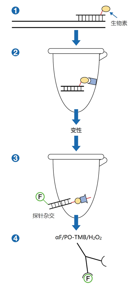 3、标签的检测 荧光色素(其中包括FITC、TRITC、AMCA、Cy3、Cy5、JOE™、FAM™、HEX™、TAMRA™和VIC™)被广泛作为标签使用(见表1)。这些标签可以直接使用荧光显微镜或PCR设备或测序仪中敏感的CCD照相机进行检测。 表1 | 常用的氟色素。荧光色素可以连接到核苷酸三磷酸酯的寡核苷酸上,如UTP、ATP、CTP,或用于qPCR、测序(SEQ)、核酸的定量和熔解曲线分析(MCA),或用作猝灭剂 FRET:福斯特共振能量转移 ISH:原位杂交 (*)当猝灭是结果时,发射波长不相关 (#) U(尿嘧啶)也可以被其他氮基取代,例如 「A」 FITC、TRITC和AMCA主要用于荧光原位杂交(FISH),特别是用于细胞或组织样品(组织学样品、细胞孢子、或细胞涂片、拭子)或临床样品微生物培养后的样品,以检测病原体。 在病理学和遗传学中,染色体异常可以用染色体特异性探针进行诊断。正确的抗褪色剂可以防止荧光信号的褪色。探针的性质强烈地决定了识别基因片段和完整染色体的分辨率(图9)。 图9 | 染色体的杂交 用四种不同类型的荧光探针对染色体进行杂交;每一种探针都有不同的分辨率,应用于蜕膜期(左栏)和界面期(右栏)的细胞中。探针越大,图像越发扩散。 来源 不可追踪。 a 带有「染色体绘画」的总探针:探针来源于一个完整的染色体库,在完整的染色体上杂交。探针被分割成碎片以促进扩散。这将在缺口翻译或随机引物中自动发生。 b 中心粒探针:一个合成的寡核探针可以识别中心粒上的重复序列((ACAAACT/ACAAATT)n)。中心粒探针可用于识别染色体数量的差异。 c 基因特异性探针是由特定的寡核苷酸或PCR或质粒探针(通常是随机引物或缺口翻译)组成的混合物。值得注意的是,这种探针只识别特定基因的独特序列。 d 某些染色体的三体化可以通过使用特异性探针进行观察 Cy3和Cy5主要用于微阵列和DNA芯片,Cy5也作为水解探针的标签。JOE™、FAM™、HEX™、™ VIC™和许多其他标签在实时PCR中以不同的组合使用。 4、触变剂 触变剂经常被用作引物和探针的标签。知名的触变剂是氟色素(FITC)、地高辛、溴脱氧尿苷和生物素。除了氟染色剂,标签不提供可检测的信号。为了使其可视化,需要有报告基团(见图2)。酶(过氧化物酶、碱性磷酸酶、ß-半乳糖苷酶)、胶体金颗粒和氟色素都是报告基团的例子。每种报告基团类型都可以通过适当的技术进行可视化。 中间试剂如合子特异性抗体将报告基团与合子现场耦合/结合在一起(图4(3a))。由于抗体的特异性只基于分子的抗原结合部分(Fab;Fragment抗原结合),而不是分子的其他区域,这允许后续的检测反应,基于共同的分子。这主要是在分子的Fc部分(Fragment crystallizable)(见图4(3))。这可以是Fc特异性的,报道标记的第二抗体或Fc-检测蛋白A或G(图4(3))。通常使用一个合子/标签系统。 链霉亲和素-生物素介导的检测:生物素标签可以被检测,不仅可以用生物素引导的抗体,还可以有效地用微生物肽;链霉亲和素(图4(3b,4)和图3)。报告基团如酶或荧光色素可以与链霉亲和素偶联。链霉蛋白-生物素检测被广泛使用,既可用于直接杂交,也可与几种PCR策略相结合,如PCR-ELISA(见图10)。 图10 | PCR-ELISA 用生物素化引物和生物素-dUTP进行常规PCR后,样品被稀释1/20,并在涂有链霉亲和素的96或384孔ELISA板中孵化。扩增物通过链霉亲和素-生物素的相互作用被捕获,之后进行几个洗涤步骤。通过经典的TMB/H2O2-酶反应,使用带有过氧化物酶报道的特异性抗体来检测荧光铬标记的扩增物。 一种更便宜的替代检测,只需要一个生物素标记的引物,通过链霉菌素建立检测。链霉亲和素被固定在平板上,然后进行变性,只有一个氟铬标记的扩增物特异性探针与(生物素化的)单链扩增物杂交。 一个链霉菌素分子有四个生物素的结合点。其中一个需要与生物素化的扩增物或杂交的生物素化的探针进行高亲和力反应。三个生物素结合位点用于与生物素/报道复合物结合。这样,许多生物素化的酶分子或其他报告基团可以通过链霉菌素叠加到一个生物素标签上。荧光染色体与生物素以严格的比例耦合到可以通过生物素与链霉菌素结合的载体(例如BSA)上。使用提拉米特放大法可以进一步增加信号(见图11)。 图11 | 碱性磷酸酶检测(不溶性产物) 碱性磷酸酶催化NBT/BCIP的磷酸化。自发的氧化还原反应后形成不溶性沉淀物。NBT(硝基蓝色氯化四氮唑)是一个质子受体,将在红色的福马赞中转移,而BCIP(5-溴-4-氯-3′-吲哚磷酸对甲苯胺盐)将被解磷化,并在蓝色的不溶性物质(5,5′-二溴-4,4′-二氯化靛)中还原。两种参与的结果都是紫色的参与。这种技术经常用于膜上或原位杂交。 5、报告基团 报告基团直接(荧光色素)或间接(酶、胶体金)提供荧光或吸光信号,用于识别杂交探针(见图2)。当应用荧光色素作为报告基团时,可以通过荧光显微镜或CCD荧光测量仪同时检测(直接检测)。PCR广泛使用荧光色素,尽管有些平台使用间接检测。 当报告基团本身不产生信号而需要额外的步骤进行可视化时,就需要间接检测。目前,酶是最广泛使用的。结合与固相(尼龙膜、细胞、组织)的杂交,它们会产生一个沉淀物。在某些情况下,需要一个可溶性的产品,如ELISA格式。酶总是需要一个可溶性底物来转化为可检测的产物。 过氧化物酶使用过氧化物(H2O2)作为底物,与非特异性质子供体结合(图12)。 TMB = 溶剂的质子供体(黄色)。 DAB = 细胞、组织和膜中反应的质子供体