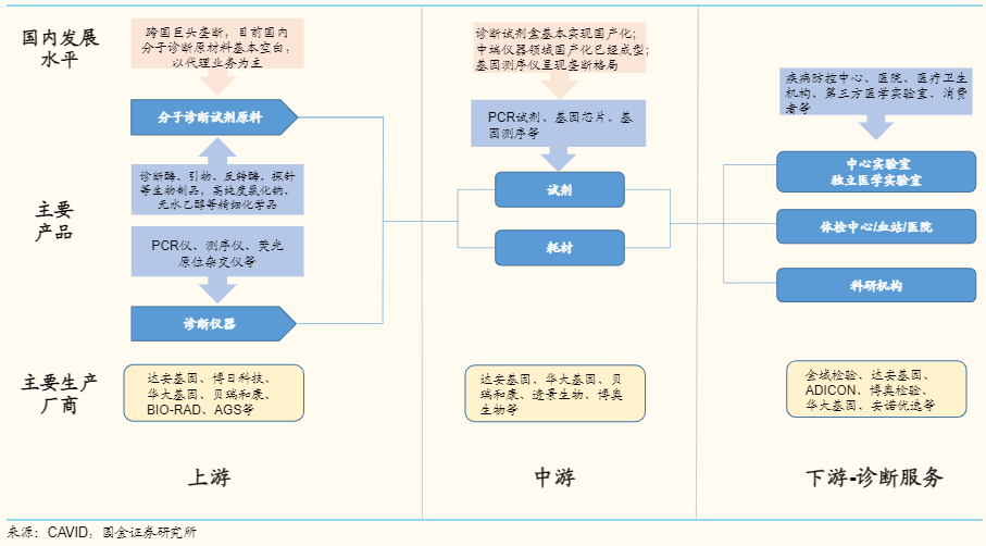 图4.国内分子诊断竞争格局 分子诊断产业链上游原材料被外企牢牢把持,中游试剂盒及仪器已逐步实现国产化,下游以各类医疗服务机构和第三方医学实验室为主。