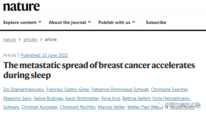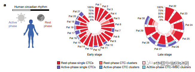 | 从2020年开始,女性乳腺癌首次超过肺癌,成为全球排行榜上第一的癌症。据世界卫生组织国际癌症研究机构发布的数据显示,2020年,在新确诊的癌症患者中,乳腺癌约占新发癌症病例的11.7%,即每8名患者中就有1名是乳腺癌患者。虽然乳腺癌的发病率高,但属于预后较好的癌症类型。如果患者发现及时,通常会有良好的治疗反应;但当癌症已发生转移时,治疗将会变得困难得多。然而到目前为止,癌症研究领域还没有对肿瘤何时转移的问题给予太多关注。因为,研究人员普遍认为肿瘤会不间断地释放癌细胞。2022年6月22日,发表在《Nature》上的一项最新研究中,来自苏黎世联邦理工学院(ETH)和巴塞尔大学领导的研究团队颠覆了此前的普遍观点,他们在乳腺癌患者和小鼠模型中发现,睡眠期间,正是乳腺癌循环肿瘤细胞高效率转移的时候。这意味着,患者睡着,肿瘤醒来。这一发现有望显著改变未来癌症的诊断和治疗方式。  癌症的转移扩散是通过循环肿瘤细胞(CTC)在血液中扩散实现的。CTC是包括乳腺癌在内的几种癌症转移级联反应的先头部队。然而,通常情况下,决定转移活性生成的时间动力学在很大程度上没有特征。因此,研究人员通常会认为循环肿瘤细胞会不断从生长的肿瘤中脱落,或由于机械损伤而脱落,进而发生转移扩散。在这项新研究中,为了调查循环肿瘤细胞的转移特征,研究人员招募了30名患有进展期乳腺癌的住院女性患者,其中21名患者被诊断为早期乳腺癌(无转移),9名患者在抽血时被诊断为IV期转移性疾病。她们没接受治疗或暂时停止治疗,并在同一天的活动期(上午10:00)和休息期(上午4:00)接受了血液样本采集。 研究人员观察到患者循环肿瘤细胞生成动态的惊人和意想不到的模式:大多数的(78.3%)循环肿瘤细胞出现在休息期(上午4:00)采集的样本中。研究共同通讯作者、ETH分子健康科学研究所生物系Nicola Aceto教授解释说:“这意味着,当患者睡着的时候,肿瘤就会醒过来。”为了检验上述发现的普遍性,研究人员又使用了四种不同的乳腺癌小鼠模型进行了测试。他们发现,与患者数据一致,绝大多数(超过90%)循环肿瘤细胞出现在小鼠的休息阶段。由于小鼠的昼夜节律与人类相反,因此,它们的乳腺癌肿瘤在日间时更具侵袭性。随后,研究人员对这些循环肿瘤细胞进行了单细胞RNA测序分析,结果显示,有丝分裂相关基因在休息期显著上调。与活动期脱落的循环肿瘤细胞相比,休息期脱落的循环肿瘤细胞分裂得更快,因此具有更大的转移倾向。 研究人员表示,每天不同时间采集的样本中,循环癌细胞的水平存在很大差异。此外,还有一个线索是,与人类相比,小鼠每单位血液中发现的癌细胞数量多得惊人。这是由于实验室的啮齿类动物在白天睡觉,而这正是研究人员收集大部分样本的时间。他们还发现,这种增强的肿瘤转移能力是由以时间依赖性方式发生的高增殖率所赋予的,并且受到昼夜节律调节激素褪黑色素、睾丸激素和糖皮质激素作用的影响。它们决定了循环肿瘤细胞的生成时间动力学。Aceto说:“我的一些同事在清晨或傍晚工作。有时候,他们也会在不固定的时间分析血液样本。这项研究告诉我们,医疗工作人员可能需要系统地记录他们进行组织活检的时间,这将有助于得出更具可比性的数据。”该团队下一步是找出如何将这些发现纳入现有的癌症治疗中,以优化治疗策略。Aceto教授还希望调查不同类型的癌症是否与乳腺癌有类似的表现,以及如果患者在不同的时间接受治疗,是否能使现有疗法更加有效。论文链接: https://www.nature.com/articles/s41586-022-04875-y