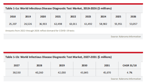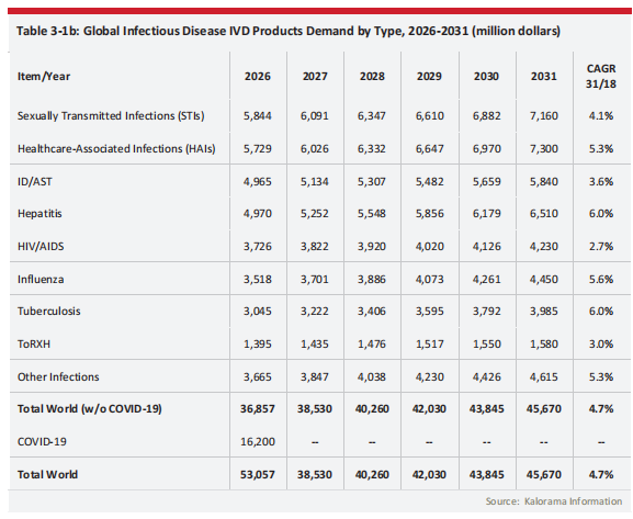 据Kalorama Information的一份关于传染病诊断全球市场分析报告显示,2021年,全球对传染病检测产品的需求总计为625亿美元,其中超过332亿美元来自COVID-19检测。 预计到2031年,试剂、检测试剂盒和耗材检测的全球需求将接近457亿美元,较2018年平均年增长4.7%。 调研报告显示,全球对传染病检测产品的需求将与整个全球IVD市场同等的速度增 长。除COVID-19检测外,传染病仍将是IVD行业的很大部分,占未来10年年收入的38%以上。 增长机会:传染病IVD产品的全球最快增长机会将在性传播感染、医疗保健相关感染、乙型肝炎、丙型肝炎、流感和真菌感染的分子检测中发展;以及对医疗保健相关感染、乙型和丙型肝炎、流感和结核病的快速免疫分析。POC检测将在近患环境中是增长最快的,但在数量上将继续远远落后于实验室检测。 成熟市场:性传播感染、艾滋病和TORCH相关的微生物检测和免疫分析仍将是主流收入来源,但随着潜在患者基础的扩张放缓,需求增长相对较慢。随着疫苗接种和掩蔽活动的增加,新病例数量的减少,全球COVID-19检测市场将下降到可忽略不计的水平。 竞争对手:罗氏、生物梅里埃、雅培、丹纳赫、BD、索灵、伯乐、Hologic、Quidel、赛默飞等是传染病检测产品和技术的全球市场领导者。 地理市场:基于高水平的国家卫生支出和患者活动,以及私人医疗提供者在美国医疗保健系统中发挥的巨大作用。美国将继续是最大和最多样化的传染病检测市场。中国、印度和墨西哥将是发展中经济体中最显著的国家,预计将大幅扩大诊断能力,使传染病检测产品的快速增长远高于平均水平。 发病率、流行率和死亡率:性传播感染(sti)和疟疾占新感染和现有感染的数量最大,而脓毒症、结核病和肝炎造成的死亡人数最多。 0 传染病检测细分领域 传染病IVD检测由试剂、检测试剂盒和耗材组成,可在手工或在自动免疫分析、分子或常规微生物仪器上进行。预计到2031年,全球对这些测试的总需求将略高于457亿美元,较2018年平均年增长4.7%。 在世界范围内,最畅销的传染病IVD检测的应用包括: