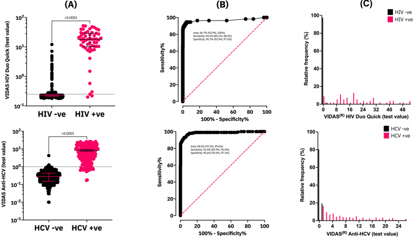 VIDAS HIV Duo-Quick是第四代酶联荧光分析(ELFA),能够检测p24抗原和HIV抗体。VIDAS anti-HCV是第三代ELFA,利用NS3、NS4A和NS4B抗原检测抗HCV抗体。这两种分析均作为包含所有必要试剂的ready-to-use试纸出售,VIDAS台式免疫分析仪自动执行方案(即清洗、培养和检测),从而最大限度地减少操作员错误。与手动96孔板血清学分析相比,VIDAS系统操作更简单,成本显著低于其他商业免疫分析仪,如Abbott Alinity或Bio-Rad BioPlex 2200。VIDAS HIV Duo Quick和anti-HCV在血清和血浆中表现出色,但目前缺乏DBS的表现数据,尤其是在血清监测方面。