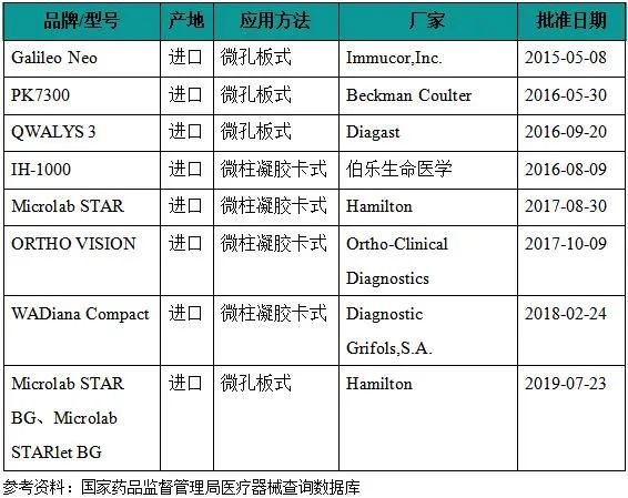 2015年,Galileo Neo全自动血型分析仪(图1)进入国内市场,采用微孔板式方法运行,检验项目包括ABO血型检测、Rh(D)血型检测、IgG红细胞抗体检测、红细胞显型和抗原筛选;2016年,贝克曼的微孔板式全自动血型分析仪(图2)进入国内市场;同年,伯乐微柱凝胶法全自动血型分析仪(图3)开始在国内上市。Immucor公司的Galileo Neo(图1)、贝克曼公司的PK7300(图2)、法国迪卡斯公司的QWALYS 3和哈美顿博纳图斯公司的Microlab STAR BG、Microlab STARlet BG均是基于微孔板法技术的全自动血型分析仪,以微孔板作为实验载体。其中法国迪卡斯公司的QWALYS 3是以红细胞磁化技术为基础的微孔板式全自动血型分析仪。伯乐的1H-1000(图3)、哈美顿博纳图斯公司的Microlab STARlet IVD(图4)、强生的ORTHO VISION(图5)及盖立复的WADiana Compact(图6)均是基于微柱凝胶法,以微柱凝胶卡作为实验载体的全自动血型分析仪。其中,哈美顿博纳图斯公司具有微孔板式及微柱凝胶卡式两种方法学的全自动血型分析仪。微柱凝胶检测技术作为血型检测的先进方法学,是国际卫生组织推荐的最先进的检测技术,进口全自动血型分析仪呈现出由微柱凝胶法替代微孔板法的趋势。详见表1.进口全自动血型分析仪品牌及厂家。