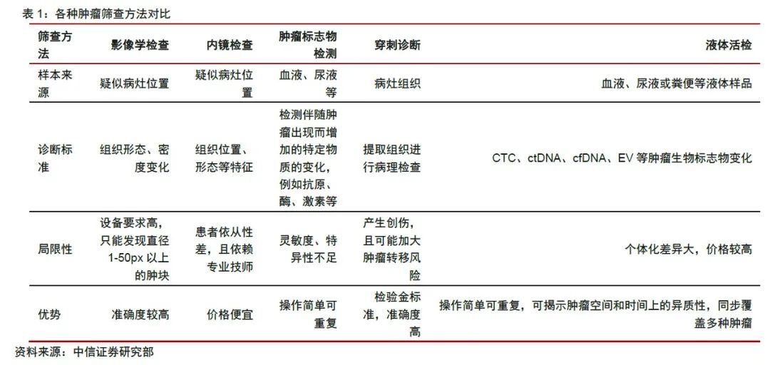 近年来,国家政策端对肿瘤早筛领域给予大力支持,相继出台多项重磅政策。2022年4月2日,健康中国行动推进委员会办公室发布《健康中国行动2022年工作要点》,旨在从政策层面推广普及肿瘤早筛,深入构建全国性的肿瘤防治体系。2021年10月15日,卫健委等部门联合发布《关于印发肿瘤诊疗质量提升行动计划的通知》,部署2021—2024年间开展肿瘤质量提升行动计划,明确提出推进肿瘤早期筛查。此外,在多项国家发展规划中都表示,将基因检测作为重点发展的新兴产业,全力推动癌症早诊早治。 之所以如此重视肿瘤早筛早诊,与当前我国肿瘤患病人数与日攀升,抗癌形势突出不无关系。据Globocan 2020年数据统计,中国每年新发癌症病例457万例,死亡病例300万例,均居全球首位。据国家癌症中心、Frost & Sullivan数据,我国恶性肿瘤发病人数逐年上升,预计2025年患病人数为520万人,2030年将达580万人。从肿瘤流行病学来看,当前我国肺癌发病情况高居首位,其次是胃癌,而且整体五年生存率均显著低于美国,究其原因即中国癌症患者初诊的晚期比例远高于美国,说明国内肿瘤早筛普及率较低,仍有大幅上升空间。 高居不下的患者、艰巨的抗癌任务及国家政策的大力鼓舞,在多重因素交织下国内肿瘤检测市场亟待爆发。据 Frost & Sullivan 数据,国内肿瘤高通量基因检测市场规模由2016年的7亿元至增至2021年41亿元,复合年增长率为41.1%。预计2025年和2030年,市场规模将分别达到 149 亿元和 491 亿元,呈现快速增长态势。尤其是肿瘤早筛早诊市场,在2021到2025年间预计年复合增长率高达100.1%,远超过用药指导,越发向治未病的医疗理念靠拢。这是医学发展的必然趋势。 全球及中美前十大新发癌症(2020) 我国肿瘤基因检测市场规模(2016—2030E) 来源:Frost & Sullivan 、世和基因招股书 肿瘤基因检测的完整闭环包含四大维度:预防、早筛、诊疗和监测。其中早筛目前涉及的检测癌种有肠癌、肺癌、肝癌、胃癌、乳腺癌、宫颈癌、泌尿肿瘤等。从技术层面可划分为影像学检查、内镜检查、穿刺诊断、组织活检等物理手段、肿瘤标志物检测的生化手段及液体活检的分子诊断。 从特点上分析,影像学和内镜检查依赖于专业医师、技师、护理人员经验和设备水平;肿瘤标志物检测的灵敏度、特异性不够,多用于辅助诊断;穿刺诊断侵入性强,多用于术中和术后,早筛应用较少;唯有近年来兴起的液体活检取样简单可重复,泛癌种或单癌种检测均能应对,更能满足众多高风险人群的筛查需求,必将成为未来大规模筛查的主要手段。 液体活检是一种非侵入式的血液测试,通过采集患者发病部位的体液,如血液、唾液、汗液、粪便、尿液及分泌物等,监测肿瘤或转移灶释放到血液的循环肿瘤细胞(CTC)、循环肿瘤DNA(ctDNA)碎片以及外泌体(Exosome)。该技术核心在于检测微量核酸变异,包括点突变、染色体结构变异及表观遗传学如甲基化水平分析等,以下重点介绍液体活检技术及相关产品研发进展。 各种肿瘤早筛的技术特点对比 来源:中信证券 CTC检测