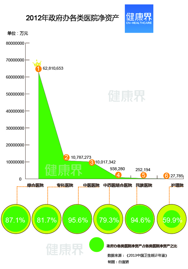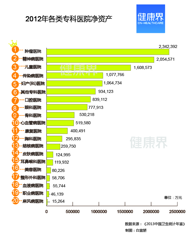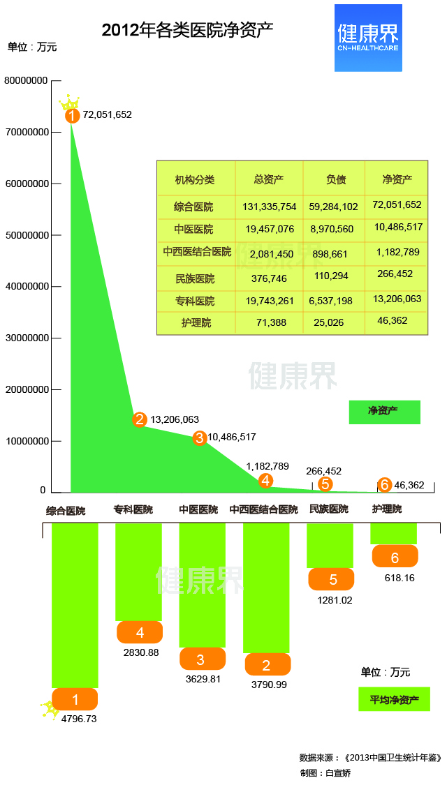 2012年,综合医院净资产位居第一,其中政府办综合医院净资产占综合医院净资产的87.1%。而专科医院中,肿瘤医院以净资产2,342,392万元排名第一。 近日,公立医院如何瘦身的问题再引起热议。从经济学角度来看,机构扩张与其经济实力分不开,中国各类医院的经济实力又如何呢?健康界从《2013年中国卫生统计年鉴》中发现一些有意思的现象,综合医院经济实力雄居榜首,而专科类别中,肿瘤医院的实力排在第一位。 《2013年中国卫生统计年鉴》根据类别,列出了每类医院的净资产。健康界发现,2012年,中国的综合医院以净资产72,051,652万元位居榜首。其中,政府办各类医院的净资产中,综合医院净资产以62,810,653万元位居首位。政府办综合医院净资产占到综合医院净资产的87.1%。 根据《医院财务制度》,医院净资产是指医院资产减去负债后的余额。这些余额包括事业基金、专用基金、待冲基金、财政补助结转(余)、科教项目结转(余)、未弥补亏损等。医院净资产的来源于财政收入、医院经营结余和其他不需要偿还的资金。净资产的大小反映了医院的资金实力和规模大小。 《2013年中国卫生统计年鉴》显示,2012年,中国医院总净资产97,239,834万元, 其中综合医院净资产72,051,652万元,位居榜首。其次,专科医院以13,206,063万元位居第二位。接下来是中医医院以净资产10,486,517万元、中西医结合医院以净资产1,182,789万元、民族医院以净资产266,452万元及护理院以净资产46,362万元分别位居第三、四、五、六名。 《2013年中国卫生统计年鉴》解释,按照机构类别,医院包括综合医院、中医医院、中西医结合医院、民族医院、各类专科医院和护理院。 然而,如果从各类医院的平均净资产来看,其排名却发生了变化。根据《2013年中国卫生统计年鉴》,2012年,中国医院总数量为23170个,其中综合医院有15021个,中医医院有2889个,中西医结合医院312个,民族医院208个,专科医院4665个,护理院75个。 根据上述数据,2012年,综合医院的平均净资产为4796.728047万元,中医医院平均净资产为3629.808584万元,中西医结合医院平均净资产为3790.990385万元,民族医院平均净资产为1281.019231万元,专科医院平均净资产为2830.881672万元,护理院的平均净资产为618.16万元。 不难看出,综合医院的平均净资产依旧排名第一,但其他医院类别却发生了变化。中西医结合医院平均净资产排名第二位,中医医院平均净资产排名第三位,专科医院的平均净资产排名第四位,第五名及第六名分别是民族医院和护理院。 值得注意的是,政府办的各类医院净资产排名和各类医院净资产排名一致。其中,政府办综合医院、专科医院、中医医院、中西医医院、民族医院和护理院的净资产分别占上述各类医院净资产的87.1%、81.7%、95.5%、79.3%、94.6%和59.9%。 另外,从各类专科医院的净资产排名看,《2013年中国卫生统计年鉴》还显示,肿瘤医院以2,342,392万元排名第一,精神病医院以2,054,571万元排名第二,儿童医院以1,608,573万元排名第三。 来源:健康界 |