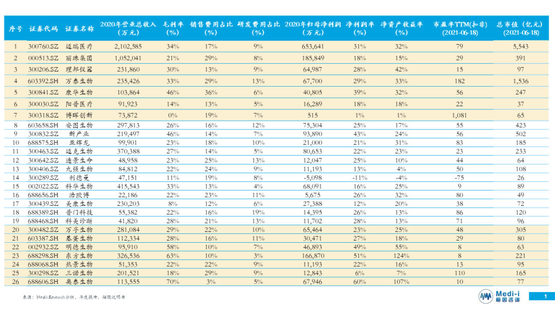 27-28 IVD业务以肿瘤伴随诊断检测为主,包括艾德生物、睿昂基因。艾德生物各项指标优于睿昂基因。 29-31 IVD业务以基因测序服务为主,包括华大基因、贝瑞基因、诺禾致源。诺禾致源市值竟然为贝瑞基因的2倍。 32-34 IVD业务以肿瘤早筛为主,包括燃石医学、泛生子、诺辉健康。大抵是临床试验、拓客都很费钱,诺辉健康营收远低于燃石医学和泛生子,但其市值约等于燃石医学与泛生子之和。 35-38 IVD业务以分子诊断为主,包括凯普生物、圣湘生物、硕世生物、之江生物。受益于COVID-19疫情,可持续性存疑。 39-41 第三方诊断实验室,包括金域医学、迪安诊断、达安基因。 42-43 集约化服务提供商,包括润达医疗、赛力医疗。 44-45 IVD业务以尿液诊断为主,包括迪瑞医疗、爱威科技。爱威科技些许高估。 46 IVD业务以病理诊断为主,如安必平。 47 IVD业务以血液诊断为主,如赛科希德。 资料来源:招股说明书、年度报告等 |