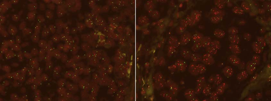 01 探针类型 原则上,存在三种不同的原位杂交探针类型。它们是: 1) 基因座特异性探针,针对感兴趣的特定基因或基因结构。这些靶标通常与肿瘤学的诊断有关,这种探针类型包括枚举探针和易位探针。 2) 另一种探针类型是全染色体涂抹探针,用于在多色荧光原位杂交(FISH)或光谱核型中可视化大型结构性染色体畸变。使用全染色体绘画探针的技术是由细胞学中使用的传统核型技术发展而来。 3) 最后一种原位杂交探针是重复序列探针,用于重复区域或结构的可视化,如端粒、中心粒、RNA物种或病毒DNA。 针对rRNA的重复序列探针可能具有物种特异性,用于通过原位杂交鉴定微生物。 02 位点特定的探针和标签 在福尔马林固定和石蜡包埋(FFPE)组织上进行原位杂交以进行基因座特异性测定时,探针通常由小的双链DNA分子组成,其大小范围明确,低于500bp。荧光标签或aptens通过缺口翻译、PCR或类似技术从修饰过的脱氧核苷酸(如dCTP-荧光素、dUTP-Cy3)加入探针。双链探针与基因组中的靶标区域相同,通过变性和杂交过程,标记的探针与靶标DNA中的互补序列退火。 荧光或明视野显微镜用于探针的可视化,取决于偏好、标签类型和方法设计。荧光探针可以在FISH中直接观察,也可以转换为发色信号,然后用明视野显微镜观察。原则上,所有探针标签类型,如荧光素、Cy3、DNP、地高辛和生物素,都可以通过额外的步骤实现明视野显微镜的可视化,使用抗合剂酶联抗体或链霉菌素来引导色原在标签部位的沉积。 探针和测定设计的一个重要方面是探针是否持有非特异性或重复性序列,这些序列将存在于靶标区域之外。当存在重复序列时,通常需要阻断这些序列以抑制背景并保持测试的特异性。探针设计和商业探针生产的最新发展使得探针不含重复序列。 03 枚举探针 图1 | 荧光原位杂交信号模式的简化图。枚举探针用于量化扩增或缺失的情况。基因重排探针,如融合探针,有助于识别特定的基因融合,而断裂探针表明特定基因的断裂事件。扁平的黄色方块代表绿色和红色的部分重叠信号。 最著名的例子是HER2计数探针,用于测定乳腺癌和胃癌组织中17号染色体上HER2扩增子的拷贝数,具有很大的临床影响。联合使用HER2计数探针和具有不同标签的参考探针可在同一测试中进行,以确定染色体拷贝数的变化,并给出HER2扩增子与17号染色体中心区(CEN-17)的比率。 图2 | 根据HER2 IQFISH pharmDx产品(Agilent Technologies),HER2和CEN-17染色的乳腺癌标本的荧光显微镜图像。HER2扩增子产生来自Texas Red标记的HER2探针的红色信号,而CEN-17区域可以观察到来自异硫氰酸荧光素标记的CEN-17探针的绿色信号。图片代表HER2非扩增乳腺癌标本(左图)和HER2扩增乳腺癌标本(右图)。 图2显示了用Dako品牌的HER2 IQFISH pharmDx产品(安捷伦科技)染色的乳腺癌标本的荧光显微镜图像的真实例子。这些图像表示乳腺癌组织在荧光显微镜的双滤光片中的视图,其中红色和绿色同时被观察到。使用该产品,肿瘤细胞有微弱的红色核背景染色,在HER2非扩增组织(左图)和HER2扩增组织(右图)中均可观察到明亮的红色(HER2)和绿色(CEN-17)的特异性信号。 指示染色体拷贝数的参考探针通常测定相关染色体的中心区域,但也可能被设计为测定非中心区域。原则上,所有驱动致癌基因或肿瘤抑制基因都是原位杂交的候选基因,因为它们可能作为生物标志物具有预测和预后的作用。 04 转位探针(断裂或融合) ALK探针是一种易位探针,用于确定在预定的断点是否发生了DNA断裂。如前所述,该探针说明了2号染色体内的重排情况。这种类型的探针被称为断裂探针或分裂探针。易位测定的原理要求两个或多个探针一起使用(见图1)。 在断裂设计中,两个具有不同标签的探针位于一个已知的DNA断裂点的两侧。在没有DNA断裂的情况下,这些探针将呆在一起,因此它们的标签将在很近的地方被观察到。如果发生了涉及靶标区域之间的断点的易位,探针就会相互分离,这在显微镜下可以观察到间隔的信号。在被调查的肿瘤组织中发生易位事件的频率可以通过计算几个肿瘤核的事件来量化。 由断裂探针检测到的DNA断裂事件可以起到预测作用,如NSCLC中的ALK断裂探针。由于设计的原因,这种类型的探针不能识别重新排列的基因组区域。相反,双融合探针可以识别合并的特定基因组区域(见图1)。双融合探针用不同的颜色标记已知合并的独立基因组区域。在没有被测定的重排的情况下,信号是分开的。如果双融合探针所覆盖的特定重排已经发生,则单色信号消失,观察到合并的信号。 05 传统和寡核苷酸库探针设计 直到最近,现有的探针生成技术需要使用基因组DNA文库,在大肠杆菌或酵母中繁殖一个或多个覆盖人类靶标区域的精选克隆。在用作原位杂交探针之前,要对载体(如宇宙体、细菌人工染色体、P1衍生的人工染色体或酵母人工染色体)携带的人类DNA进行纯化、标记和片段化。尽管使用克隆和标记的人类DNA给测试设计带来了挑战,但这种技术仍被用于HER2列举和ALK重排探针的伴随诊断探针产品。 由于人类DNA同时拥有特异性和重复性的DNA元素,探针的重复性部分可能会因产生背景而影响特异性。重复性元素产生的背景可以通过使用未标记的重复性人类DNA或直接添加到探针中的PNA[17]进行阻断,或在探针生产过程中采用减法,在组织上使用前从克隆的人类DNA中去除重复性元素。最