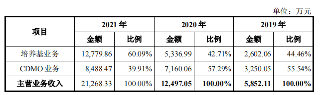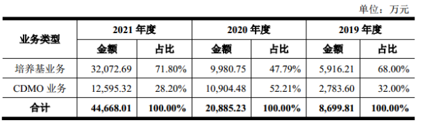 培养基公司拓展CDMO业务主要基于这两方面考虑:一方面培养基+CDMO能形成业务协同作用,另一方面CDMO市场体量大,2021年中国细胞培养基市场规模为26.3亿人民币,而生物制品CDMO有159亿人民币。 根据国家药品监督管理局2021年6月发布的《已上市生物制品药学变更研究技术指导原则(试行)》,培养基属于生物制品生产企业的重要原材料,培养基关键成分的变更均根据实际情况纳入变更参考类别,按要求提供相应说明及更新材料。因此,对于生物制品生产企业,一般在临床前研究阶段选定细胞培养基供应商后,在临床研究和商业化生产过程中不会轻易变更。 所以在客户研发阶段,培养基公司就会介入,从源头开始与客户形成深度合作,增强客户粘性,并随客户产品研发的不断推进,最终获取商业化生产订单,实现销售规模的大幅增加。 而CDMO是实现这一目标的途径,而且自主研发的培 养基产品也能够提升 CDMO 服务的核心竞争力,培养基和CDMO能产生很好的协同作用。 奥浦迈与康方生物于2015年开始合作,初期以定制化培养基产品开始合作,2021 年,基于多年来培养基业务的往来合作,康方生物开始向公司采购 CDMO服务。 2021年,公司对康方生物实现 CDMO 服务收入1,070万元,完成从培养基客户到CDMO 客户的业务转化,体现了培养基和CDMO的协同作用。 不过目前两家公司CMDO能力略有不同,澳斯康的CDMO业务可以实现生物制药/品从临床前技术开发到商业化生产,目前已有一个项目实现商业化生产;而奥浦迈仅提供临床前至临床早期阶段(临床I期和临床II期)的中试生产服务,尚未布局临床III期及商业化项目。 澳斯康营收结构: 奥浦迈营收结构: