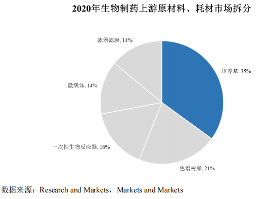 细胞培养基是生物制品生产的关键核心原材料,选用合适的、高质量的培养基可以大幅度提高生物制品表达量,降低生物制品的单位制造成本。 生物制药培养基是上游生物制药最重要的耗材之一,在2020年生物制药耗材市场占比达到35%,2020年生物制药耗材分品种市场占比如下所示: