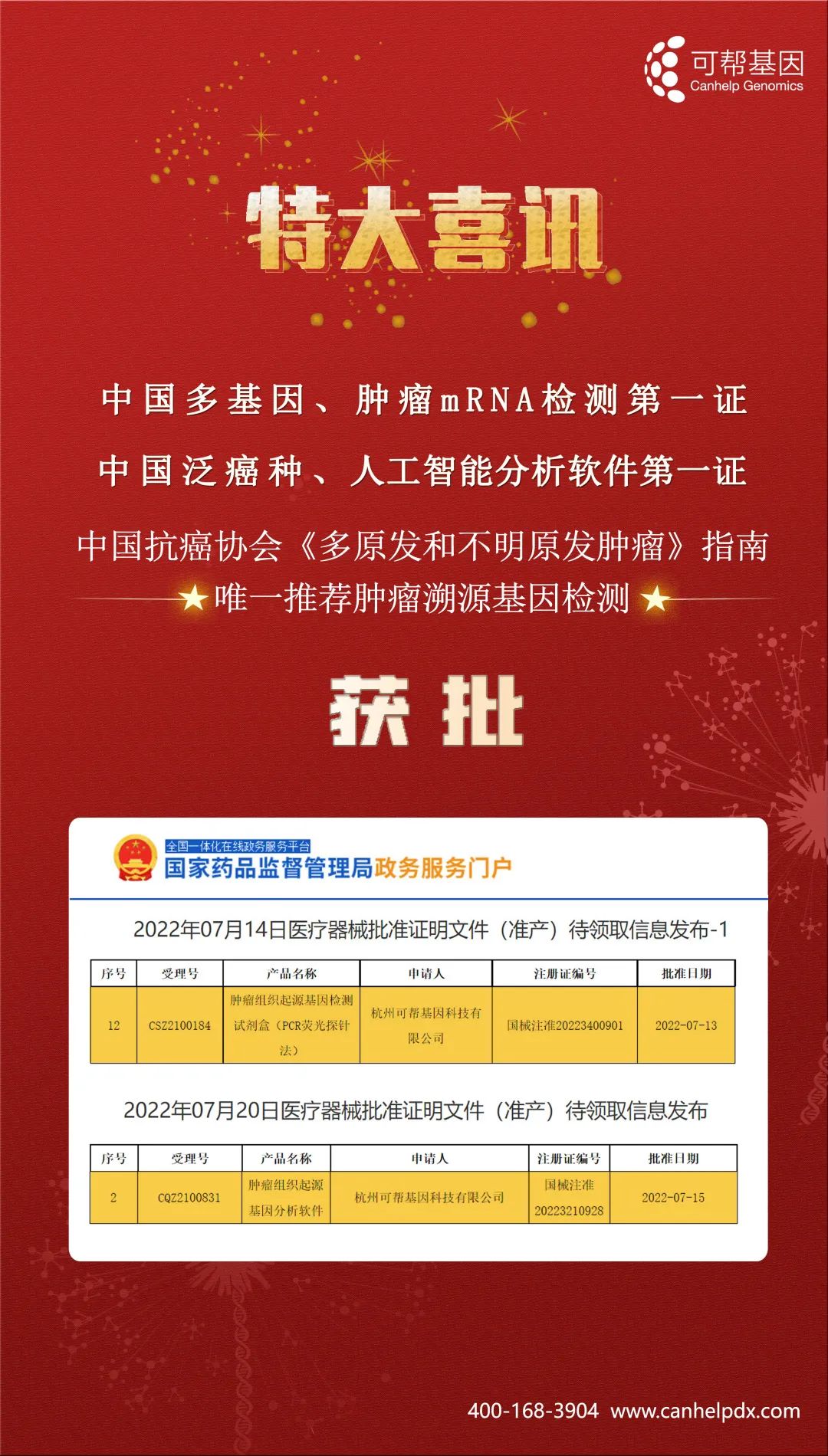 近日,由杭州可帮基因科技有限公司(下文简称“可帮基因”)自主研发的肿瘤组织起源基因检测试剂盒(PCR荧光探针法)、肿瘤组织起源基因分析软件(下文统称“肿瘤组织起源基因检测”)分别通过国家药品监督管理局(NMPA)的审核,正式获批第三类医疗器械注册证(国械注准20223400901、国械注准20223210928)。 肿瘤组织起源基因检测试剂盒是国内首个获批的泛癌种、多基因mRNA检测试剂盒,适用于组织分化程度较差或疑似转移的实体肿瘤患者的福尔马林固定、石蜡包埋组织样本。通过检测样本中90个组织特异基因表达模式(Gene Expression Pattern),并与肿瘤组织起源基因分析软件联合使用,用于判别肿瘤样本的组织起源。 自2015年起,可帮基因积极联合北京大学肿瘤医院、复旦大学附属肿瘤医院、中国科学院大学附属肿瘤医院、浙江大学附属第一医院、浙江大学附属邵逸夫医院等多家医疗机构开展肿瘤组织起源基因检测的临床应用研究,取得多项丰硕成果,在Journal of Molecular Diagnostics、Journal of Translational Medicine、Modern Pathology、Cancer Cell International、Cancer Medicine、Frontiers in Oncology等国际学术期刊,发表SCI论文十余篇。 2022年7月9日,由中国抗癌协会组织编著的中国首部《多原发和不明原发肿瘤》诊治指南正式发布。中国抗癌协会多原发和不明原发肿瘤专委会主任委员胡夕春教授表示:“肿瘤组织起源基因检测,作为国内自主知识产权的创新技术,经过多中心、大规模中国患者人群的临床验证,对于鉴别肿瘤组织起源具有良好的性能,因此推荐用于多原发(大于等于2个恶性肿瘤)和不明原发(找不到原发灶)的恶性肿瘤患者鉴定和寻找原发灶,是目前唯一获批的辅助分子诊断工具。” 可帮基因创始人徐清华博士表示:“自成立以来,可帮基因始终专注于创新肿瘤mRNA诊断产品的研发与产业化。衷心感谢国家、省、市、区主管部门的指导与帮助,全国多家临床研究单位的支持与合作。通过肿瘤组织起源基因检测试剂盒及分析软件的注册报批,可帮基因积累了肿瘤mRNA诊断产品技术研发、生产质控、临床试验、注册报批等多个维度的重要经验。我们将在此基础上,继续以患者为中心,以临床需求为导向,结合人工智能核心技术,持续打造更多有价值、有意义的肿瘤基因检测产品。让医生更有力量,让患者更有希望!” |