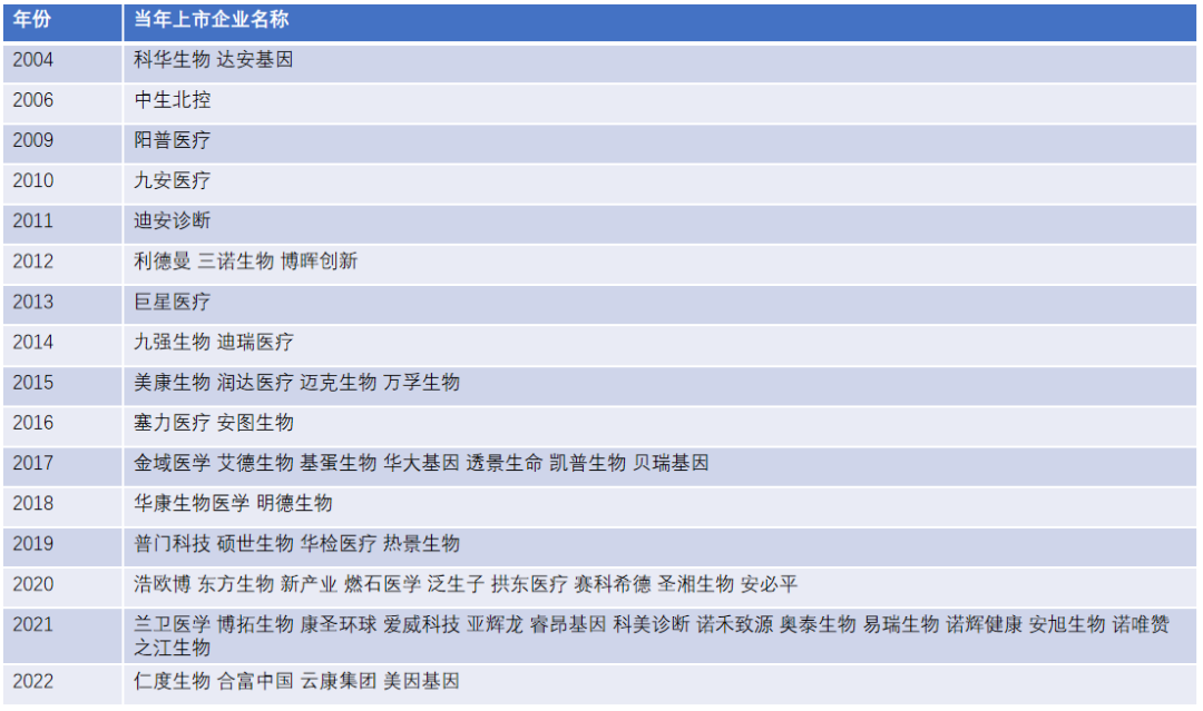 | 截至2022年6月30日,国内主营体外诊断业务(体外诊断业务营收占比达50%以上)上市企业已达58家。涵盖生产、服务(第三方医学检验ICL)、流通(贸易)三个板块。其中生产型企业42家(包括2家主营体外诊断实验室耗材的企业):东方生物、达安基因、热景生物、圣湘生物、科华生物、迈克生物、安图生物、万孚生物、硕世生物、明德生物、凯普生物、新产业、九安医疗、三诺生物、美康生物、之江生物、奥泰生物、诺唯赞、博拓生物、九强生物、安旭生物、基蛋生物、拱东医疗、亚辉龙、艾德生物、迪瑞医疗、阳普医疗、普门科技、博晖创新、透景生命、易瑞生物、利德曼、科美诊断、安必平、中生北控、浩欧博、仁度生物、睿昂基因、赛科希德、诺辉健康、爱威科技、华康生物医学。服务型企业11家:迪安诊断、金域医学、华大基因、诺禾致源、兰卫医学、云康集团、贝瑞基因、康圣环球、泛生子、燃石医学、美因基因。流通型企业5家:润达医疗、巨星医疗、华检医疗、塞力医疗、合富中国。