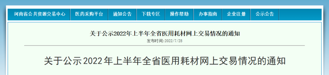 7月28日,河南省公共资源交易中心公布了《关于公示2022年上半年全省医用耗材网上交易情况的通知》(以下简称通知)。