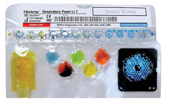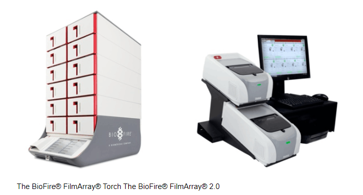 搭配的机器就是下图右边的这款Filmarray2.0系统,是一款非常不错的分子POCT产品,机器是2016年拿到国家药监局的注册证(国械注进20163222753)的,但是在试剂的报证上面一直是命途多舛,与赛沛GeneXpert系统不同的是Filmarray系统做的产品都是10重以上的多联检,比如说呼吸道、肠道、血流、肺炎等按病种分类的多病原检测菜单,有兴趣的同学可以点这个链接进行了解。