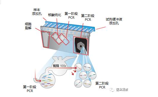 在仪器运行前,操作人员只需在测试条两端分别加入试剂缓冲液和样本混合液即可,如图样本会在图示核酸提取部分完成提取纯化,然后在进行第一阶段的PCR,初步扩增DNA片段,把原始底物放大,然后在第一轮PCR扩增产物的基础上,完成第二阶段巢式PCR扩增,最后利用熔解曲线进行分析数据,得出结论。