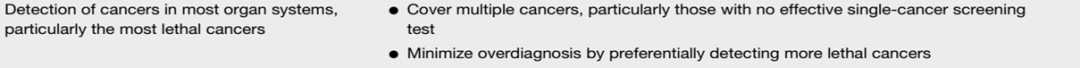 MCED:Multi-Cancer Early Detection 第一条:关于癌肿覆盖 MCED覆盖绝大多数肿瘤 (尤其是那些极为致命的癌肿) 1. 覆盖多个癌肿(尤其是目前尚无有效筛查手段的癌肿); 2. 倾向于检出更多致命性癌肿,从而使得过度治疗最小化。 第二条:关于敏感性 MCED具有较高的敏感性 (从而足以有较高肿瘤检出率及绝对数量) 1. 具有在许多癌肿类型中检出肿瘤的能力; 2. 作为现有肿瘤标准早筛手段的有效补充; 3. 能够检出较早期肿瘤。 第三条:关于假阳性率 MCED具有极低的假阳性率(FPR) 1. 未患肿瘤的筛查人群最小化相关后续进程; 2. 最小化筛查相关焦虑; 3. 最小化医疗卫生资源占用。 第四条:关于阳性预测值 MCED具有相对较高的阳性预测值(PPV) 1. 应在特殊人群中应有较高的筛查效率,因为PPV综合考虑癌症发病率和检测产品敏感性; 2. 通盘一起考虑所有癌肿时,PPV应该是高的。 第五条:关于癌肿溯源 MCED能准确定位原发肿瘤部位 1. 有助于优化肿瘤评估及相关流程; 2. 准确做到肿瘤溯源,减少对错误器官相关非必要操作。 第六条:关于临床价值 MCED需被论证具有临床价值 1. 使用随机干预临床试验进行临床验证; 2. 临床试验终点设计为降低筛查人群诊断晚期肿瘤数量或降低癌症相关死亡率; 3. 具有较高性价比。 第七条:关于可及性 MCED具有便宜且可获得的特征 1. 使用率增加(特别是难以触及的人群); 2. 无需检测前使用药物或其他步骤准备; 3. 无需特殊装备/人员/其他资源去进行采样,血液样本能在常温运输及处理; 4. 从接收样本到结果出具时间较短; 5. 对医疗卫生系统或个人是可承受支付的检测。