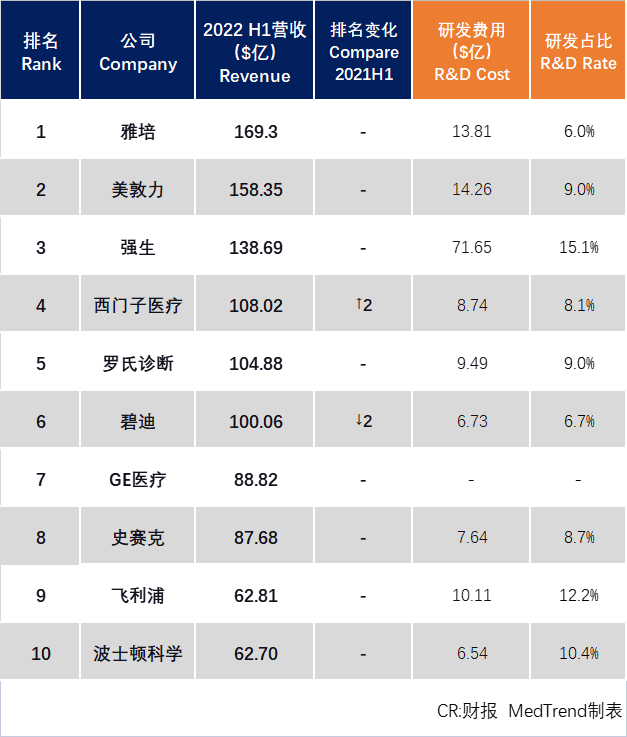 *按实时汇率:1瑞士法郎=1.0543美元;1欧元=1.026美元;因汇率统计不同,折算后的美元营收仅做参考。*统计为医疗业务营收;飞利浦仅考虑医疗营收Diagnosis&Treatment和Connected Care两个部分数据。*美敦力2022财年H1区间为2021年4月28日到2021年10月30日。(下同)*碧迪医疗、西门子医疗2022财年H1区间为2021年10月1日-2022年3月31日。(下同)*研发费用均指业务/集团总研发费用支出,占比也是业务/集团营收;各企业统计口径不一,数据仅供参考。