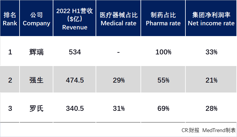总业绩:辉瑞“称霸”,全球药械同行望尘莫及 按全球药械企业统计,排名TOP 3依次是:辉瑞、强生、罗氏。