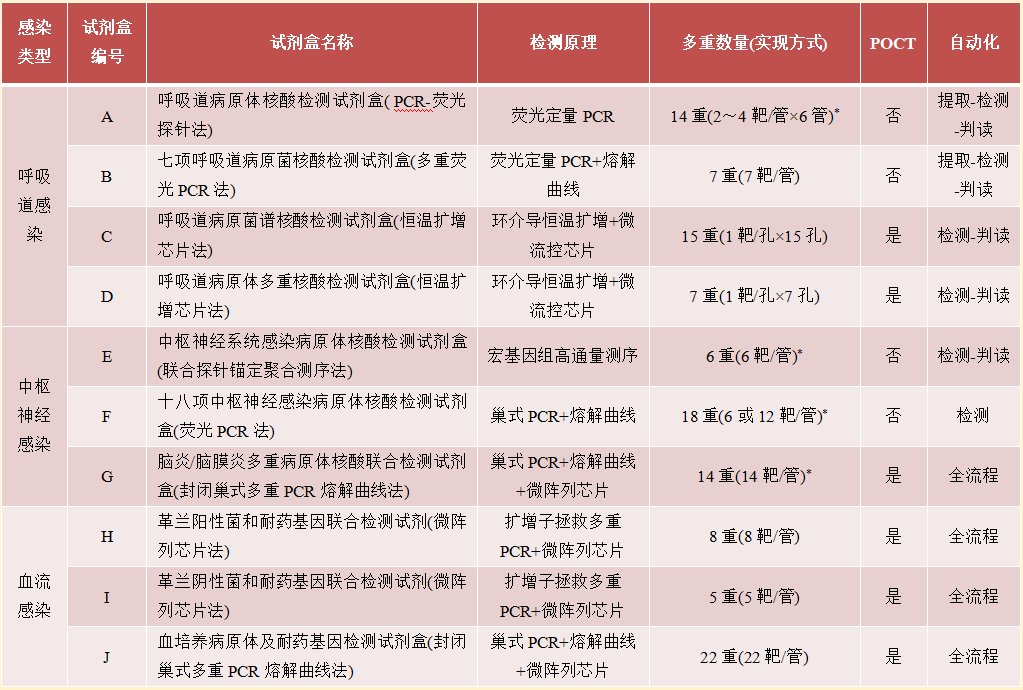 作者:刘东来 周海卫 沈舒 ,通讯作者:许四宏 摘要 目的 了解我国病原菌多重核酸检测试剂盒的分析性能的现状,特别是检出限性能的基本情况,为相关研发企业和医疗机构使用者提供参考。 方法 根据体外诊断试剂行业标准《细菌和真菌感染多重核酸检测试剂盒(标准号YY∕T 1725-2020)》,使用“34种细菌和真菌感染多重核酸检测试剂国家参考品(批号370026-201801)”对10种不同检测技术原理的病原菌多重核酸检测试剂盒的分析性能做了评估,包括阳性符合率、阴性符合率、重复性及检出限等进行质量评价,并按照国家参考品的质量标准对评价结果进行统计分析。 结果 10款试剂盒中包括4款呼吸道感染、3款中枢神经感染及3款血流感染试剂盒,检测范围或病原谱覆盖8种革兰阳性细菌、14种革兰阴性细菌及10种真菌和非典型病原体。各试剂盒的阳性符合率、阴性符合率、重复性及检出限等分析性能均符合国家参考品的质量标准。呼吸道、中枢神经及血流感染类试剂盒病原菌谱及检出限性能差异较大,检出限的中位值分别为5×103 CFU/ml、1×103 CFU/ml及1×106 CFU/ml;各试剂盒病原菌谱中分布和出现频率较高的6种病原菌分别为肺炎链球菌(检出限的中位值为5×102 CFU/ml)、金黄色葡萄球菌(3×103 CFU/ml)、流感嗜血杆菌(1×103 CFU/ml)、铜绿假单胞菌(5×104 CFU/ml)、鲍曼不动杆菌(3×106 CFU/ml)及大肠埃希氏菌(5×104 CFU/ml)。结论 我国已经进入体外诊断试剂注册阶段的病原菌多重核酸检测试剂盒均具有较好的准确性、特异性及重复性;同时,研发企业应注意结合临床具体的需求,设计合理的试剂盒病原菌谱,并持续优化检出限性能。 [关键词] 病原菌;多重核酸检测;参考品;检出限 病原菌引起的呼吸道、中枢神经系统、血流、胃肠道及生殖道等感染性疾病具有发病急、进展快等特点,且临床发病率和病死率较高,对人类健康构成严重威胁。近年新型冠状病毒肺炎(coronavirus disease 2019, COVID-19)疫情发生以来,临床继发性病原菌合并感染更是会严重威胁COVID-19患者的生命[1-2]。迅速地确定感染病原体对于患者的治疗及预后十分关键。尽管目前临床传统的病原菌检测方法仍以培养及表型鉴定为主,分离培养虽然是病原学诊断的“金标准”,但检测周期长、操作繁琐、敏感性低等已无法满足临床诊治的需求。与之相比,分子诊断技术的速度发展,在突发性感染的评估、感染早期的发现、监测及病原菌耐药基因分析等领域发挥了越来越重要的作用[3-7]。 近年来逐渐发展的病原菌多重核酸检测技术,即在一个核酸反应体系中同时对多个靶标病原菌进行检测,更具有操作简便、覆盖病原菌谱广、能够分辨混合感染等优势,正受到越来越多的关注和应用。目前,美国FDA已经批准了10余款病原菌多重核酸检测试剂盒,覆盖PCR、熔解曲线、恒温扩增及微阵列核酸芯片等技术原理;我国药监部门批准了3款试剂盒[8-9]。然而,多重核酸检测技术仍存在一些局限和挑战。例如,多重反应体系研发难度较大、试剂盒特异性和灵敏度可能会低于单一靶向反应体系、试验操作较为繁琐及检测成本较高等;另外,相关试剂盒在检测技术的选择、检测范围或病原谱的设计及检出限性能的优化等方面也面临诸多挑战。因此,为保证病原菌多重核酸检测试剂盒的质量,应特别重视相关产品的质量控制及评价研究[10]。 2018年至今,仅在中国食品药品检定研究院完成注册检验的病原菌多重核酸检测试剂盒就有将近20款,行业爆发式发展的态势已然初现。为全面了解我国相关产品分析性能的基本现状,针对10款进入体外诊断试剂注册阶段的病原菌多重核酸检测试剂盒的部分分析性能,包括阳性符合率、阴性符合率、重复性及检出限性能进行了质量评价研究。 01 材料与方法 1.1 评价方案 评价用体外诊断试剂行业标准《细菌和真菌感染多重核酸检测试剂盒(标准号YY∕T 1725-2020)》由项目组牵头制定并发布,标准基于“34种细菌和真菌感染多重核酸检测试剂国家参考品(批号370026-201801)”,对相关试剂盒的要求、试验方法及标签和使用说明书等内容进行了规定[10-12]。 上述评价用国家参考品由项目组研制并提供,参考品由34种具有特定浓度(CFU/ml)的病原菌组成,包括12株革兰阳性细菌(肺炎链球菌、金黄色葡萄球菌、无乳链球菌、单核细胞增多性李斯特菌、屎肠球菌、粪肠球菌、表皮葡萄球菌、化脓链球菌、滕黄微球菌、马红球菌、格氏李斯特菌、缓症链球菌)、16株革兰阴性细菌(脑膜炎奈瑟菌、感嗜血杆菌、嗜肺军团菌、肺炎克雷伯菌、铜绿假单胞菌、鲍曼不动杆菌、大肠埃希氏菌、产酸克雷伯菌、阴沟肠杆菌、奇异变形杆菌、粘质沙雷氏菌、干燥奈瑟氏菌、荧光假单胞菌、嗜水气单胞菌、琼氏不动杆菌、副流感嗜血杆菌)及6株念珠菌(热带念珠菌、光滑念珠菌、白色念珠菌、近平滑念珠菌、克柔念珠菌、葡萄牙念珠菌)[10]。 1.2 病原菌多重核酸检测试剂盒 进行分析性能质量评价研究的10款病原菌多重核酸检测试剂盒由7家企业(广州万孚生物技术股份有限公司、苏州创澜生物科技有限公司、华大生物科技(武汉)有限公司、梅里埃诊断产品(上海)有限公司、湖南圣湘生物科技有限公司、百康芯(天津)生物科技有限公司、上海捷诺生物科技有限公司)提供,见表1。 表1 病原菌多重核酸检测试剂盒▾ 注:*. 试剂盒A、E、F和G同时检测病原菌和病毒;PO