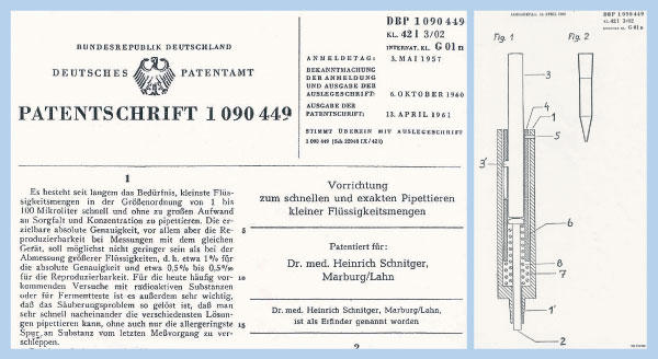 ┎ 对于学生物的小伙伴们来说,一天的大部分时间都是在实验室度过的:说起实验室的仪器设备实验狗们如数家珍,移液枪、离心机、EP管、超净台更是生物实验室的标配,是实验狗们吃饭的家伙什,但是你们真的了解它嘛? 以最常用的移液枪为例,它是谁发明的呀,什么时候发明的呀,最开始是什么样子滴,是先有移液枪还是先有枪头?是不是一无所知,瞬间陷入了装逼的盲区? 接下来熟读此文,保你以后带师弟师妹们用枪的时候,不仅讲实验口吐莲花,更能侃侃而谈聊八卦,收获他们的星星眼。┚ 赵杭 | 作者 懂个皮 | 审核 莫十二 | 编辑 1925年,海因里希·施尼特(Heinrich Schnitger)出生于德国威斯特伐利亚(Westphalia)的莱姆戈(Lemgo)。他的父亲是一位发明家,设计了一种曾经广泛使用的自行车锁。施尼特从小耳濡目染,小小年纪就可以对各种小玩意儿修修补补和升级改进,展现一个的发明家天赋。 二战期间,作为一名德国士兵,他在战场上得到一个好消息和一个坏消息。好消息是他不用上战场送死了;坏消息是,他不用上战场是因为他被检查出肺结核!从战场退下来后,海因里希开始学习医学。多年以后他向同事们提起这件事时说到,他对医学毫无兴趣,学医纯粹为了给自己治病“保护自己免受无能医生的戕害”。1957年,“平平无奇”的一年。这一年,苏联发射了第一颗人造地球卫星斯普特尼克1号;丹麦科学家延斯发现了钠钾泵;一位年轻科学家刚刚当上哈佛助教,他的名字叫詹姆斯·沃森;这一年,另外两位年轻的物理学家杨振宁和李政道得了诺贝尔奖。这一年,33岁的海因里希来到了德国马尔堡大学(University of Marburg),在生理化学研究所所长西奥多·比彻(Theodor Bücher)的研究小组做博后。