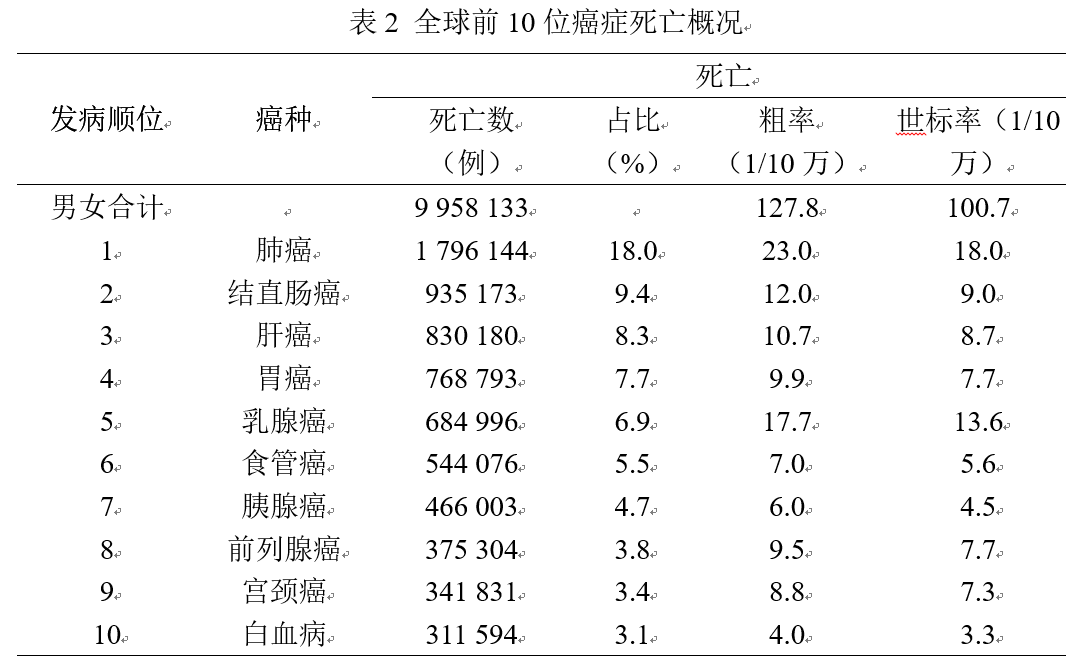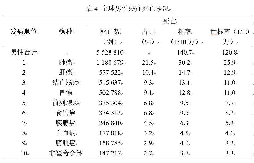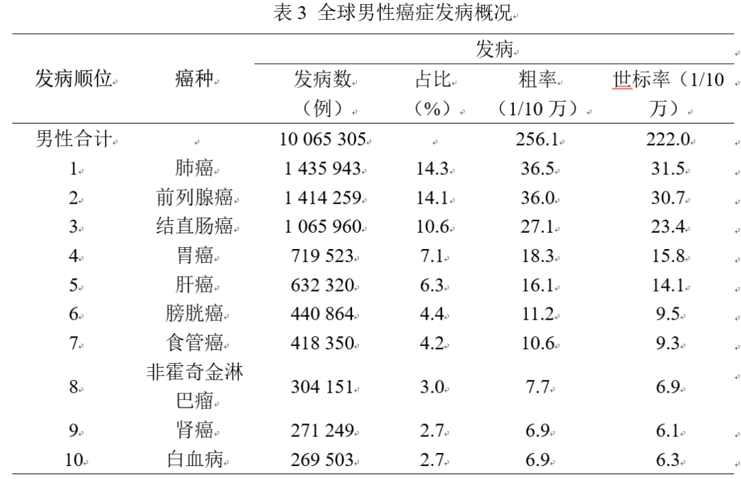 2020年,全球估计新发病例19 292 789例。女性乳腺癌首次超过肺癌成为最常见的癌症,2020年新发乳腺癌2 261 419例,占总体癌症发病的11.7%。全球新发病例数前十的癌症分别是:乳腺癌226万(11.7%)、肺癌220万(11.4%)、结直肠癌193万(10.0%)、前列腺癌141万(7.3%)、胃癌109万(5.6%)、肝癌91万(4.7%)、宫颈癌60万(3.1%)、食管癌60万(3.1%)、甲状腺癌59万(3.0%)和膀胱癌57万(3.0%)。2020年,全球估计9 958 133例癌症患者死亡,肺癌仍是导至癌症死亡的首要原因,估计有1 796 144人死于肺癌,占总体癌症死亡的18.0%。全球死亡病例数前十的癌症分别是:肺癌180万(18.0%)、结直肠癌94万(9.4%)、肝癌83万(8.3%)、胃癌77万(7.7%)、乳腺癌69万(6.9%)、食管癌55万(5.5%)、胰腺癌47万(4.7%)、前列腺癌38万(3.8%)、宫颈癌34万(3.4%)、白血病31万(3.1%)。前10位癌症类型的死亡例数占全部癌症死亡的70%以上。三、全球男性癌症发病概况
