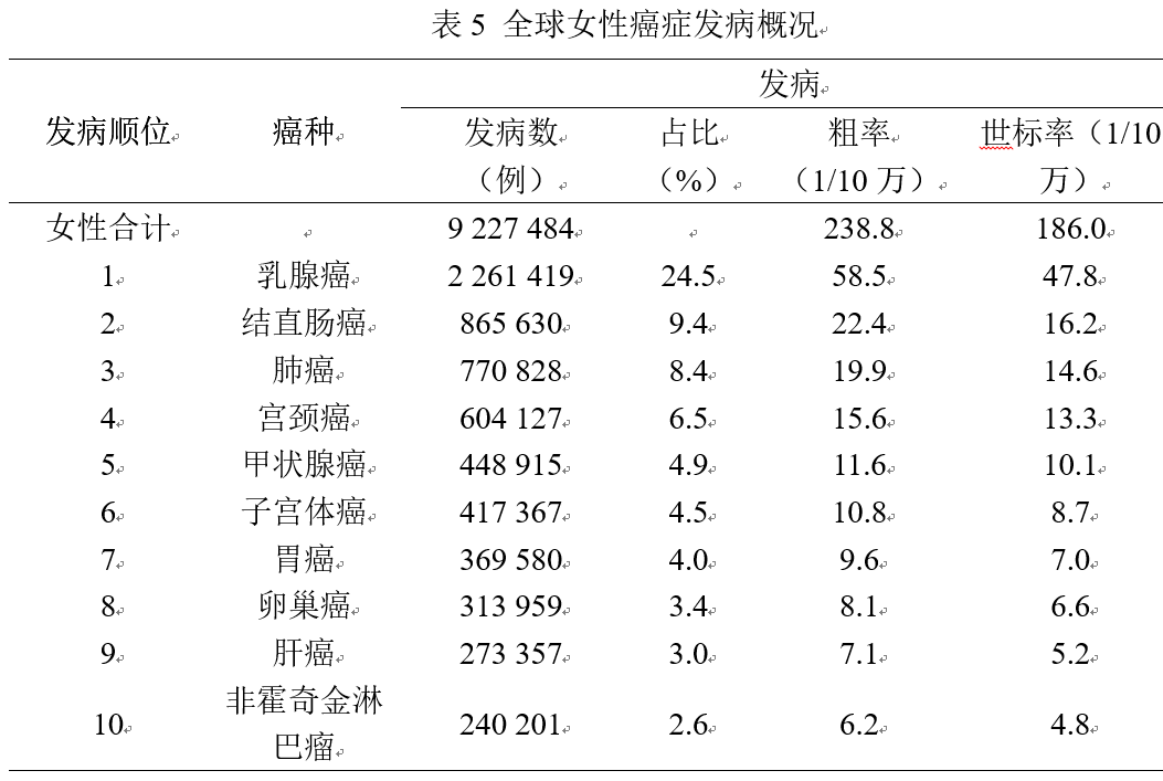 2020年,全球女性新发癌症患者估计有9 227 484例,占总数的48%,其中新发乳腺癌226万例,最为常见,远超女性其他癌症类型。全球女性新发病例数前十的癌症分别是:乳腺癌226万(24.5%),结直肠癌87万(9.4%),肺癌77万(8.4%),宫颈癌60万(6.5%),甲状腺癌45万(4.9%),子宫体癌42万(4.5%),胃癌37万(4.0%),卵巢癌31万(3.4%),肝癌27万(3.0%),非霍奇金淋巴瘤24万(2.6%),这十种癌症占女性新发癌症数的71%。六、全球女性癌症死亡概况