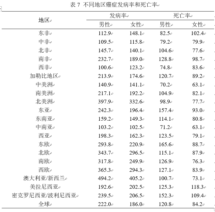 2020年,全球女性癌症死亡4 429 323例,占总数的44%,以乳腺癌、肺癌和结直肠癌最为常见。2020年全球女性癌症死亡人数前十的癌症分别是:乳腺癌68万(15.5%),肺癌61万(13.7%),结直肠癌42万(9.5%),宫颈癌34万(7.7%),胃癌27万(6.0%),肝癌25万(5.7%),胰腺癌22万(4.9%),卵巢癌21万(4.7%),食管癌17万(3.8%),白血病13万(3.0%),这十种癌症占女性癌症死亡总数的近74%。七、不同地区癌症发病率和死亡率
