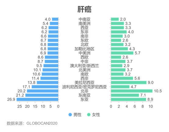 2020年,全球估计新增肺癌患者220万例(11.4%),由肺癌导至的死亡的癌症患者估计有180万例(18.0%),肺癌是全球第二大最常被诊断的癌症类型,也是全球第一大致死癌症。男性发病率和死亡率几乎均是女性的2倍。在男性中,肺癌是全球36个国家最常见的癌症,但却是93个国家首要的癌症致死原因,全球肺癌发病率最高的地区为波利尼西亚/密克罗尼西亚(51.6/10万),发病率最低的地区是西非(2.8/10万)。在女性中,肺癌是全球25个国家首要的癌症致死原因,全球肺癌发病率最高的地区为北美洲(30.1/10万),发病率最低的地区为中非/西非(1.8/10万)。图6 2020年不同地区肺癌发病情况(1/10万)结直肠癌是全球第三大常见癌症,2020年共确诊结直肠癌患者超190万例,大约93.5万人死于结直肠癌,是全球第二大致死癌症。全球范围内,结直肠癌发病率差异较大,发病率较高的地区是欧洲和澳大利亚/新西兰,非洲和中南亚的大部分地区结直肠癌的发病率均较低,最高地区的结直肠癌发病率是最低地区的9倍。图7 2020年不同地区结直肠癌发病情况(1/10万)2020年,全球前列腺癌新发病例约140万例,死亡约37.5万例,是全球第4大常见癌症和男性第2大常见癌症,占男性癌症死亡的第5位。前列腺癌是112个国家的男性中最常被诊断出的癌症,北欧(83.4/10万)、西欧(77.6/10万)、前列腺癌发病率较高。而在亚洲地区前列腺癌较不常见(发病率< 20.0/10万)。图8 2020年不同地区前列腺癌发病和死亡情况(1/10万)胃癌仍是世界范围内的一种重要的癌症,2020年有超过100万新发病例,大约有76.9万人死于胃癌,是全球第五大常见癌症和第四大致死癌症,男性中癌症的发病率约是女性的2倍。男性中,东亚(32.5/10万)、东欧(17.4/10万)和南美洲(12.1/10万)的胃癌发病率较高。在女性中,胃癌发病率最高的地区为东亚(13.2/10万),非洲地区胃癌发病率较低。图9 2020年不同地区胃癌发病情况(1/10万)肝癌是全球第六大最常见癌症和第三大癌症死亡原因,2020年约有90.6万新增肝癌病例,约有83.0万人死于肝癌,在全球大部分地区,男性肝癌的发病率和死亡率均为女性的约2~3倍。在男性中,东亚肝癌发病率最高(26.9/10万),其次是东南亚(21.2/10万)和北非(20.2/10万),中南亚男性肝癌发病率最低(4.0/10万)。在女性中北非地区的肝癌发病率最高(10.5/10万),其次是美拉尼西亚(9.0/10万)和东亚(8.9/10万),中南亚女性肝癌发病率最低(2.0/10万)。图10 2020年不同地区肝癌发病情况(1/10万)综上,全球癌症负担差异显著,但各国癌症防控形势均较为严峻。癌症的多样性提升了全球加强控制该疾病努力的必要性,各国将癌症的预防和治疗纳入到国家卫生计划中,着重强调癌症筛查的重要性和提高癌症的治疗质量,可有助于减少未来世界范围内的癌症负担和痛苦,缩小各国癌症负担差距,逐步、稳健地降低全球癌症整体负担。