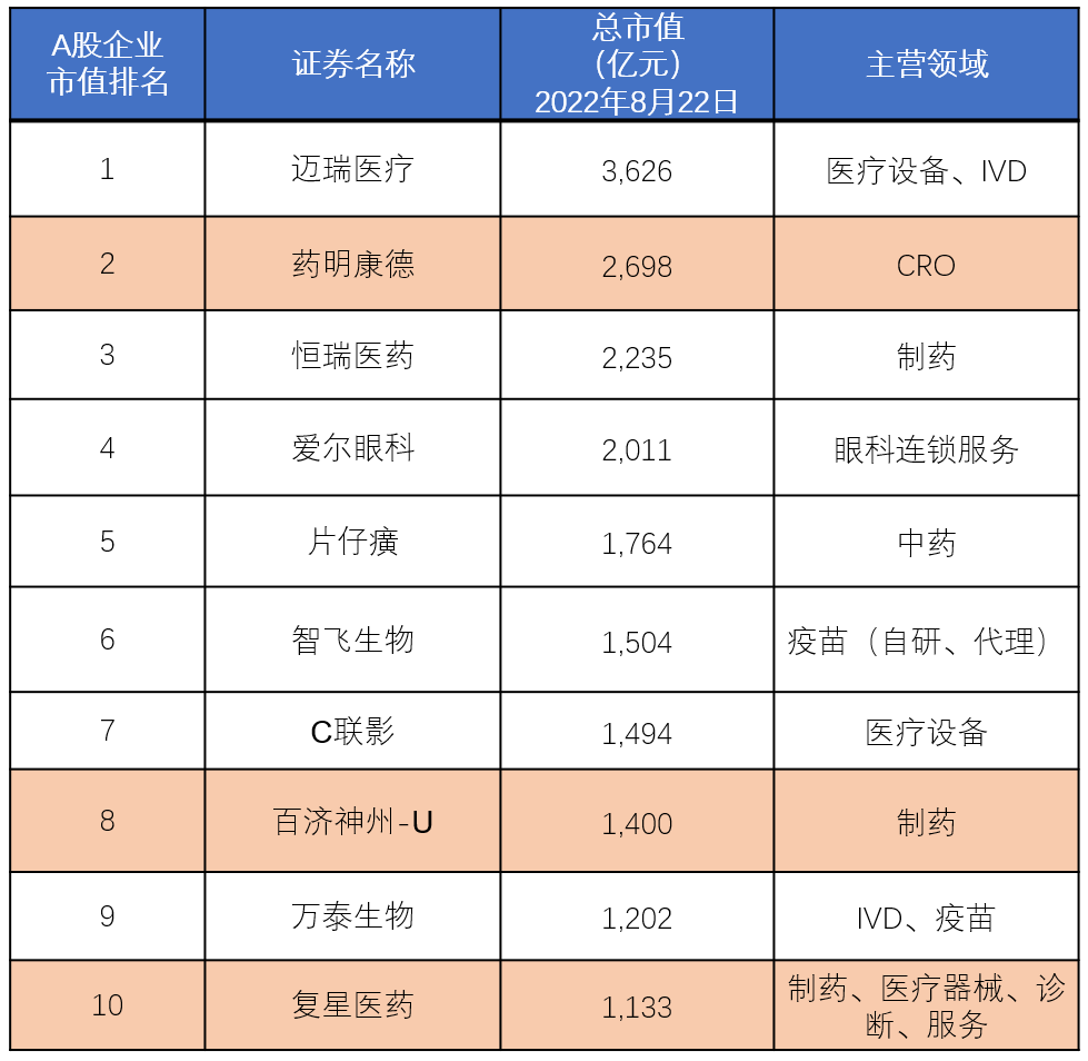 ▲A股医药生物板块(申万行业2021)市值Top10企业一览