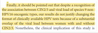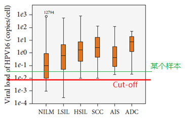 关于HPV定量的研究,最早可以追溯到1991年,但直到现在,都没有被纳入到任何一个临床指南,最主要的原因是在过去的30年中,不同研究的结果存在着很多的不一致。2007年《Nature Reviews Cancer》1(影响因子69.8)和《Lancet Oncology》2(影响因子54.4)两篇全球顶级期刊的重磅综述,明确指出HPV定量没有临床价值,虽然15年过去了,关于HPV定量的各种临床研究也很多,但小编并没有找到在全球顶级期刊中,再有关于HPV定量的综述。2007的两篇综述中所提到关于HPV定量存在的问题,至今也没有被很好地回答。随着病变程度越高,病毒发生整合的比例越高,病毒复制反而减少。在病毒的生物学机理方面,2017年美国国立卫生研究院(NIH)关于病毒整合的综述3(影响因子7.464),指出了HPV病毒生命周期的三个阶段:早期感染基底层细胞,病毒以游离的环状DNA,进行低拷贝复制 随着基底层细胞分化,病毒以游离的环状DNA,进行大量复制 病毒发生整合,病毒生命周期的终结,无法再复制,包装成环状DNA,感染新的宿主。 《Nature Reviews Cancer》1综述里指出“HPV整合的状态随着疾病严重程度的增加而增加,但整合之后带来的是病毒载量的减少。”《Lancet Oncology》2综述中提到“一些最高的病毒载量可归因于最近获得的产生大量病毒的轻微病变,类似于良性疣”。同一患者病变组织的异质性--HPV定量和组织诊断并不对等《Lancet Oncology》1综述中提到:“HPV定量是同一患者不同级别、不同大小、不同数量的病变的复杂总和,病毒载量的含义并不明确。”《Nature Reviews Cancer》2也提到“在患有高级别病变的女性中,当同时存在低级别病变,病毒载量会更高;在绝大多数的研究中,只有最严重组织病变被报告”如下2017年-2022年的三篇国内关于HPV定量的研究: 目前除了HPV 16型的定量和病变存在正相关被广泛接受,其他型别定量和病变的关系还有很多争议。全世界每天都有大量的医学研究发表,都会发现一些新的规律,其中大部分规律难以在临床实践中开展,或者在临床实践中与其他方案相比,价值有限,所以这些被发现的规律只具有科研价值,无法被纳入临床指南。只有那些与现行临床路径相比,带来更大临床获益的方案,才具有真正的临床价值。让小编抽丝剥茧,从HPV定量的一系列观点看他们真实的临床价值:1.“HPV 16型单一感染的定量结果和病变严重程度存在正向规律”。临床价值?上面介绍的复旦大学附属妇产科医院73,596例的研究6(影响因子3.464),结果显示HPV16型定量的中位数确实随着病变程度加重而升高(如下箱线图),但是图中也显示不同病变的定量上限和下限范围非常广,结果波动巨大。美国FDA强调临床使用的HRHPV检测都需要有一个针对HSIL+的临床cut-off值,以减少对良性病变的检出。我们以HSIL+下限作为临床cut-off值(红线),在此之上,NILM/LSIL和HSIL+的定量范围大都是重叠的,所以就某个具体样本的定量值(绿线)而言,无法鉴别是HSIL+,还是LSIL或NILM。同样,另外一篇2017年发表在International Journal of Cancer的文献7(影响因子:7.316),研究了5,319例非16,18型HPV病毒载量和宫颈病变(只有HSIL病例,没有癌症病例)之间的关系,研究结论是HPVA 9组中的31,35,52,58亚型的定量平均值(Mean)升高和病变风险之间具有统计学关系,但同时,数据离散度很大(SD值),病变和非病变的定量范围存在高度重合。所以文章的最后也明确指出“尽管认识到CIN2/3 与A9组中非HPV16型的病毒载量之间存在关联,但我们的结果并不能证明,改变目前临床使用的HPV 检测的设计是合理的。因为在有和没有CIN2/3 的女性之间的病毒定量范围,有很大的重叠。”在2018年福建医科大学附属福建省妇幼保健院的定量研究5也存在同样的现象。所有这些研究都反映了同一个情况:虽然从平均值看,HPV 16型在高级别病变和低级别病变的定量上存在变化的趋势,但不同病变定量范围是高度重叠的,对于某个具体样本的定量结果,无法判断是否是HSIL+,所以也无法真正作为临床的诊断标志物。基于现行临床路径,HPV 16型阳性,直接转诊阴道镜,HPV 16型定量无法进一步风险分层,所以HPV 16型定量这种和病变的相关性,只具有科研的价值,不具有真正的临床价值。2.“术前HR-HPV 病毒载量可以作为HSIL+术后病变残留的指标”,临床价值?福建省妇幼保健院309例术后随访研究8(影响因子3.738),将术后<6个月发生CIN2+定义为手术残留,将术后≥6个月发生CIN2+定义为复发,研究得出的结论,术前HR-HPV定量与手术残留密切相关,但与复发无关。要确认这个研究结论是否具有真实的临床价值,就要和现行指南中的临床路径进行比较。根据2019年ASCCP指南9,针对HSIL术后的管理,统一采用术后6个月开展HPV初筛或联合筛查进行随访。2017年Lancet Oncology一篇44,446例(97篇研究)的荟萃分析(影响因子54.4)10,术后HPV阳性对于CIN2+的敏感性达到了91.0%,远高于切缘阳性的55.8%。基于此,指南认为术后HPV检测是预测复发最准确的指标。那到底是术前HPV定量,还是术后HPV定性检测,更有价值呢?我们再深入挖掘这篇研究的内容发现,研究中同样比较了术后HPV阳性和切缘阳性这两个指标,两者对于HSIL术后无论是病变残留还是复发都具有显著相关性,而术前的HPV定量只对病变残留有一定预测能力,由此我们可以确定,术前HPV定量的效能并不如目前各大指南推荐的术后HPV检测,无法带来更大的临床获益,HPV定量的这个预测性能也仅限于科研价值。关于HPV定量在临床实践中开展,