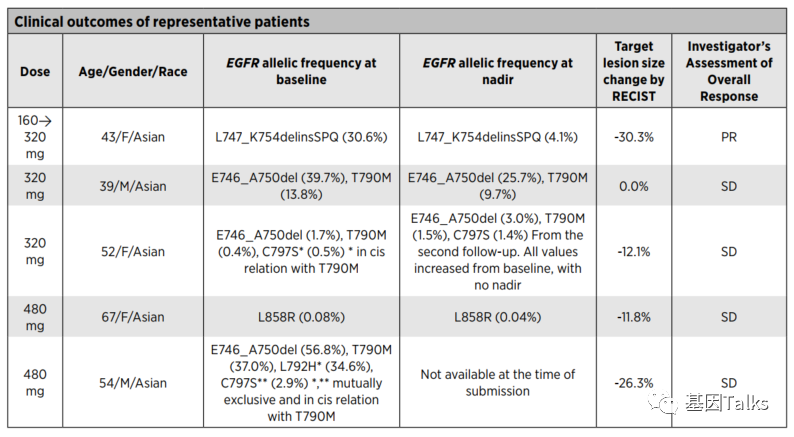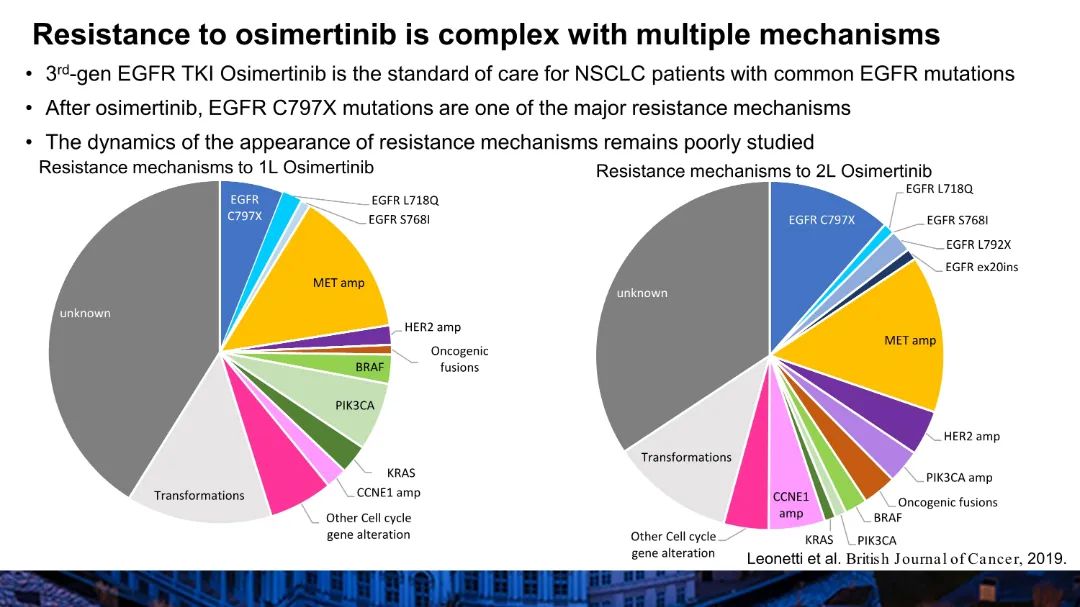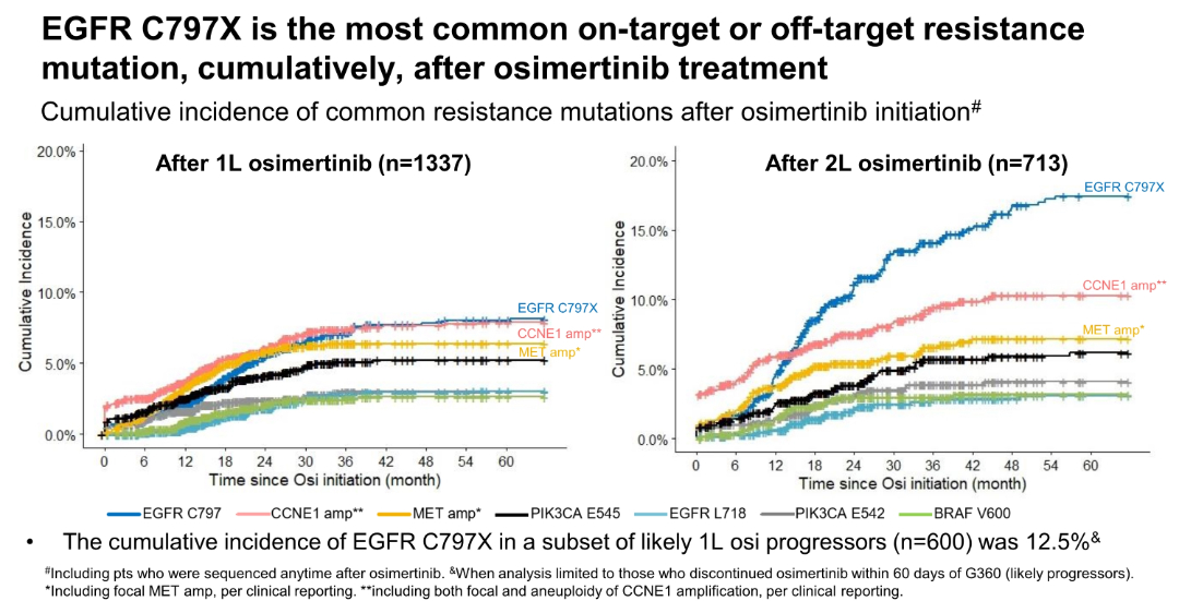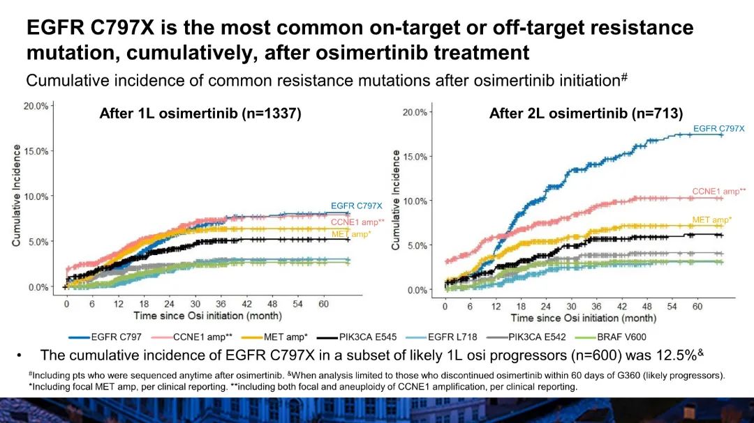 在开启今天的内容之前,我们先了解一则古希腊的神话故事:阿喀琉斯之踵(Achilles' Heel)! ![]() 阿喀琉斯(Achilles)是古希腊神话中的英雄,是凡人英雄珀琉斯(Peleus)和海洋女神忒提斯(Thetis)的爱子。忒提斯为了让儿子炼成“金刚不坏之身”,在他刚出生时就将其倒提着浸进冥河。遗憾的是,因水流湍急,阿喀琉斯的母亲捏着他的脚后跟不敢松手,所以脚踵未被冥河水浸润,留下了全身唯一的“致命弱点”。后来就是因为这个“致命弱点”,阿喀琉斯在特洛伊战争中被敌人一箭射中脚踵而死。现在常用“阿喀琉斯之踵” 譬喻这样一个道理:即使是再强大的英雄,也有致命的死穴或软肋。 奥希替尼(Tagrisso)是三代EGFR酪氨酸激酶抑制剂(EGFR-TKI),基于其与早期一代EGFR抑制剂相比的优势,现在已成为一线治疗的标准药物。该药物获得了FDA、NMPA以及其他国家监管机构的批准,用于特定EGFR突变NSCLC患者的二线、一线和辅助治疗,显著改善了EGFR突变NSCLC患者的预后。不过,患者一旦治疗进展,治疗选择将非常有限(化疗或参加临床试验)。 在最近的一系列研究中,研究人员和制药企业阐明了EGFR-TKI奥希替尼的分子耐药机制,以及几种可能用于解决这个问题的四代EGFR-TKIs药物研发管线。 2022年8月8日的WCLC上,Winship Cancer Institute(研究机构)、Guardant Health(NGS公司)和Blueprint Medicines(制药企业)合作报告了使用GuardantINFORM真实世界证据平台分析了去识别化(de-identified)的临床和基因组学数据(5年随访)结果,其中包括 65,273 名晚期NSCLC成人患者。在这些患者中,4,288名患者在一线或二线治疗中接受了奥希替尼的治疗,2,050名患者在治疗期间进行了ctDNA检测(一线1,337名,二线713名)。结果发现:EGFR C797X是最常见的靶内耐药突变,在接受奥希替尼治疗一年后,EGFR C797X耐药突变比MET和CCNE1扩增的脱靶耐药突变更常见。1 ▲ EGFR C797X是最常见的靶内耐药突变 累积分析表明,当奥希替尼用作一线治疗时,EGFR C797X突变的发生率是MET扩增的1.25倍;用作二线治疗时,是MET扩增的2.4倍。在接受奥希替尼一线治疗后可能出现疾病进展的患者中,EGFR C797X突变的累积发生率为12.5%。MET扩增是奥希替尼一线治疗第一年最常见的耐药突变,EGFR C797X突变在第二年至第五年均超过了MET扩增。 ▲ 奥希替尼1L和2L治疗后耐药突变的累积发生率曲线 此研究表明,随着患者长期接受一线奥希替尼治疗,EGFR C797X突变的频率明显增加,这加强了对四代EGFR抑制剂的需求,以解决C797X驱动的耐药性。 EGFR C797X耐药突变包括C797S和C797G(较罕见2,3),最常见突变类型还是C797S突变,即797位点的半胱氨酸残基被丝氨酸取代,导至奥希替尼与突变EGFR之间的共价键丧失(奥希替尼是通过C797氨基酸共价键不可逆地结合到某些突变形式的EGFR,如L858R、19del及T790M等4),阻止奥希替尼与EGFR活性位点结合。此外,也没有办法通过增加药物剂量来绕开它,这对奥希替尼来说是“绝对的致命弱点”,即三代EGFR抑制剂的“阿喀琉斯之踵”。 ▲ 三代EGFR抑制剂的“阿喀琉斯之踵” EGFR C797S突变已超越MET扩增成为三代EGFR抑制剂的主要耐药机制。但是目前,尚未有批准用于EGFR C797S(耐药)突变的药物。 既往临床研究发现:1)当没有T790M突变的情况下,携带EGFR C797S突变对一代和二代EGFR-TKIs敏感;2)当EGFR C797S突变与T790M突变在不同等位基因(不同染色体)中共存的情况下(反式突变)也对一代和二代EGFR-TKIs敏感;3)当EGFR C797S突变与T790M突变在相同等位基因(相同染色体)中共存的情况下(顺式突变)将会对一代、二代和三代EGFR-TKIs耐药,这时候就需要四代EGFR抑制剂(具有抗C797X的活性)来解决这一问题。5 ▲ 如何打破三代EGFR抑制剂的“阿喀琉斯之踵” 2022 WCLC的另一场演讲中,研究人员展示了一款四代EGFR-TKI BBT-176(可逆ATP竞争抑制剂,韩国制药企业Bridge Biotherapeutics)的早期数据。I期临床研究纳入大约24名既往接受过EGFR-TKIs治疗(80%使用奥希替尼)的EGFR突变患者,并进行影像学检测,每6周进行一次Guardant液体活检。6 截至2022年3月10日,共有18例患者接受了BBT-176治疗(耐受性良好,毒性可控),其中5例患者血液样本检测出EGFR三重突变(triple mutant):19del/T790M/C797S或L858R/T790M/C797S。 对18名接受治疗患者中的5名进行治疗前、后液体活检检测分析,在3例患者中观察到EGFR突变等位基因频率(VAF)降低(ctDNA分析可能有助于识别最可能受益于BBT-176的患者),包括非经典的外显子19缺失(L747_K754delinsSPQ)和T790M突变。这些变化与其中两名患者的肿瘤缩小有关。另外,最值得注意的是,2名存在三重突变(19del/T790M/C797S顺式)患者的靶病灶和非靶病灶均有缩小。所有5例患者仍在接受治疗,治疗时间均超过20周。 ▲ BBT-176药物代表性患者的临床结果 可以肯定的是,这些数据是早期的,而且只在少数几个经过筛选的患者中得到。未来,Bridge生物治疗公司将优化BBT-176的剂量,以提高耐受性和疗效。在确定II期剂量后,研究人员预计明年开始II期临床研究。 Bridge生物治疗公司并不是唯一一家致力于解决三代EGFR-TKIs耐药的制药企业。同样位于韩国的制药企业J Ints Bio也在2022 WCLC会议上分享了其针对C797S耐药突变的第四代EGFR-TKI JIN-A02的临床前数据,令人鼓舞。7 研究数据来自小鼠模型数据,但临床数据可能即将公布,因为J Ints Bio在6月份向FDA提交了一份新药研究申请,以评估JIN-A02的I/II期临床试验。 另一家制药企业Blueprint Medicines正在研究候选药物BLU-945和BLU-701,以通过靶向EGFR