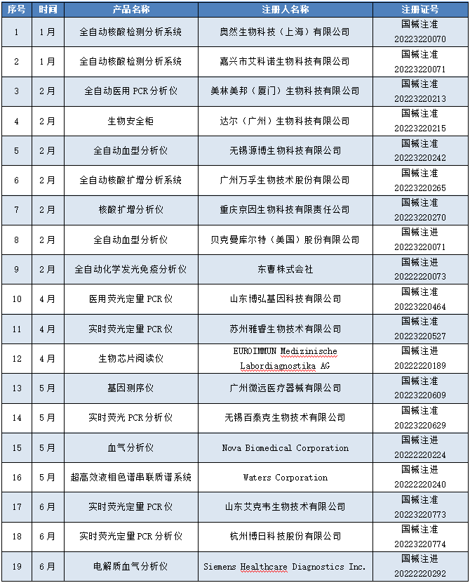 2022年1-6月共有来自19家企业的19款IVD仪器获批,其中12款为分子诊断设备,详情如下:
